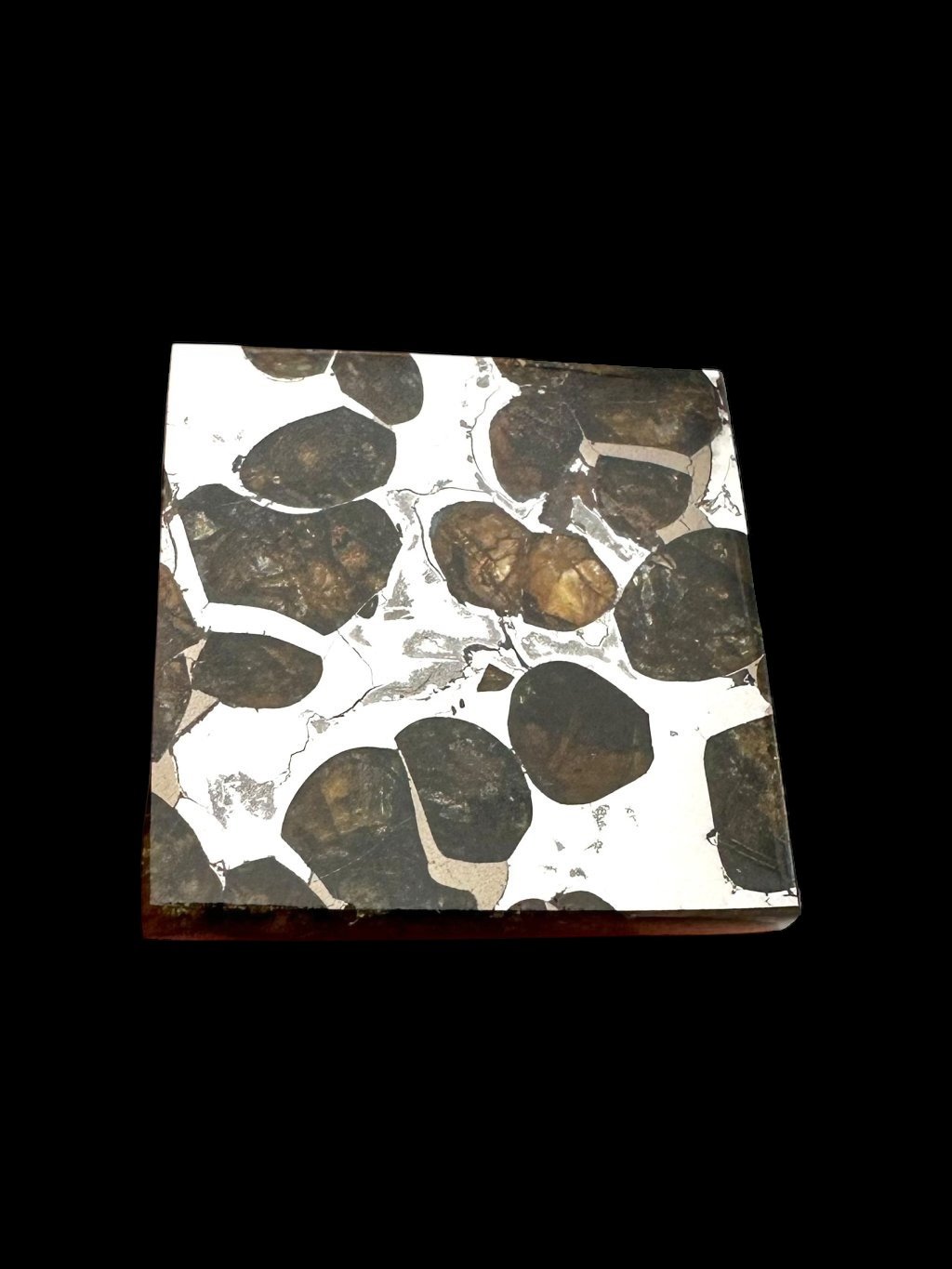 Pallasites are characterized by the presence of both metallic and silicate components in roughly equal proportions. The metallic component is primarily composed of iron and nickel. The metal matrix consists of the following major alloys: