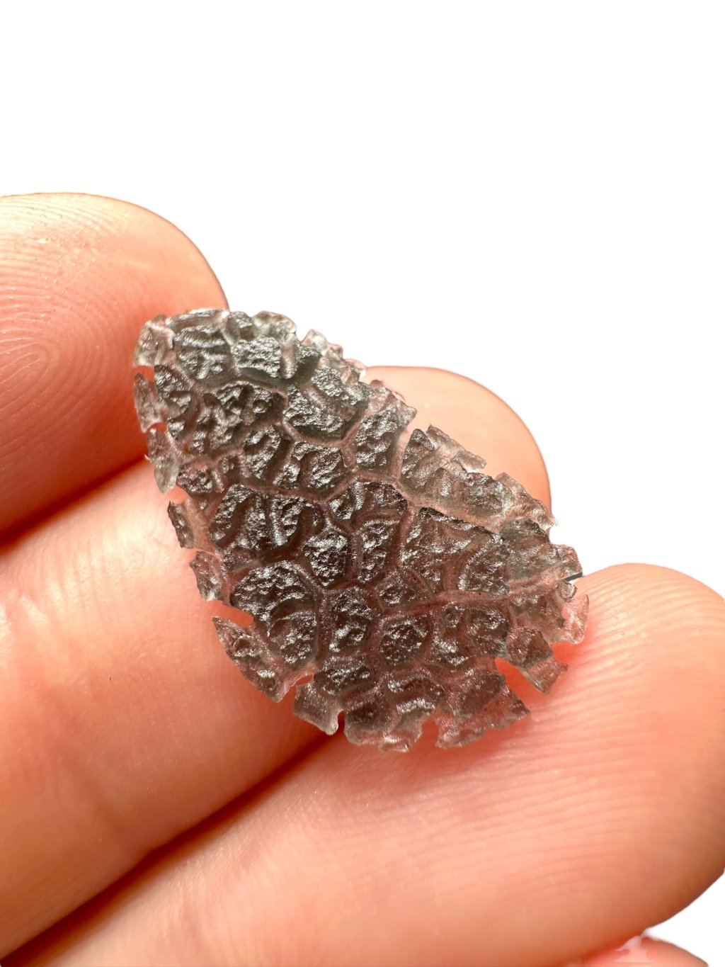 This recently discovered type of obsidian is among the most beautiful obsidians in the world. It is distinguished from other obsidians by its distinctive deep texture, which resembles South Bohemian moldavites (it is very similar to the Besednice Jezkovna). Its sculpture was formed by rapid cooling, surface cracking, and the subsequent slow action of soil acids at the specific site, just like in the case of moldavites. The exact location is currently kept secret to protect the area from diggers and potential landscape devastation. We believe that once the precise discovery site is revealed and scientifically examined, interest in this obsidian with its rare and aesthetic appearance will grow rapidly worldwide – especially due to its significant potential for use in the jewelry industry.