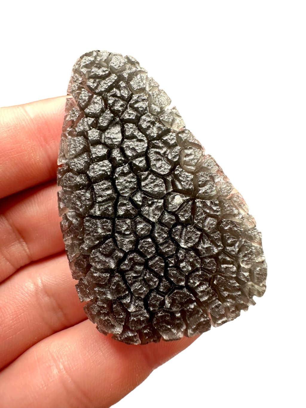 This recently discovered type of obsidian is among the most beautiful obsidians in the world. It is distinguished from other obsidians by its distinctive deep texture, which resembles South Bohemian moldavites (it is very similar to the Besednice Jezkovna). Its sculpture was formed by rapid cooling, surface cracking, and the subsequent slow action of soil acids at the specific site, just like in the case of moldavites. The exact location is currently kept secret to protect the area from diggers and potential landscape devastation. We believe that once the precise discovery site is revealed and scientifically examined, interest in this obsidian with its rare and aesthetic appearance will grow rapidly worldwide – especially due to its significant potential for use in the jewelry industry.