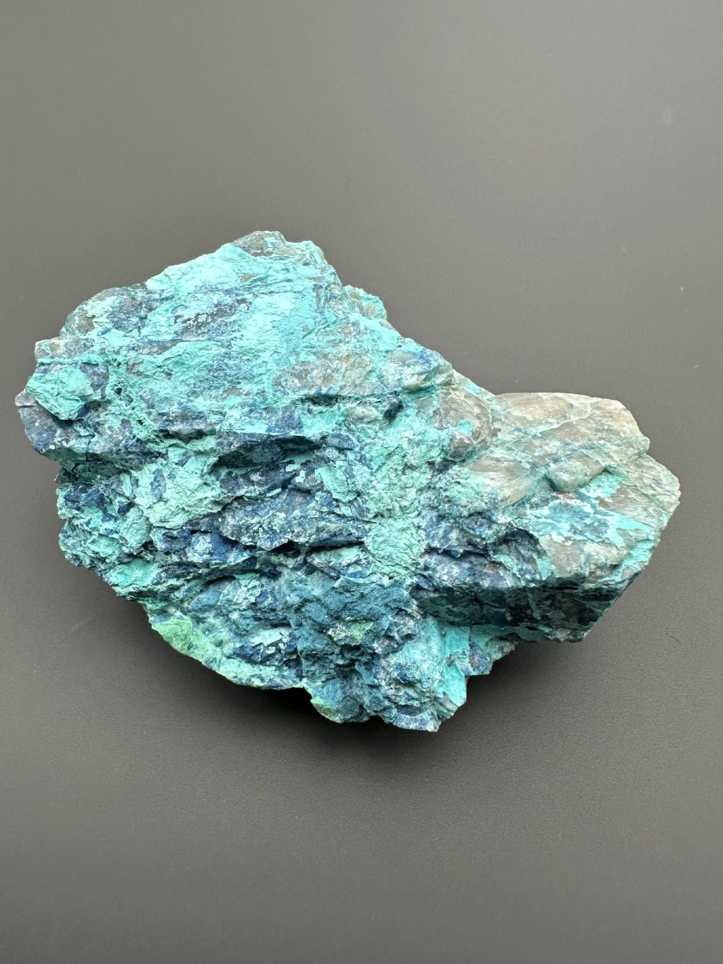 Chrysocolla typically has a matte to vitreous luster and a hardness of 2.5 to 3.5 on the Mohs scale, making it relatively soft. In nature, it appears in massive, earthy form, but can also form veins, crusts, or botryoidal (grape-like) aggregates. Due to its vivid color, it is often mistaken for turquoise, though it is softer and has different optical properties.