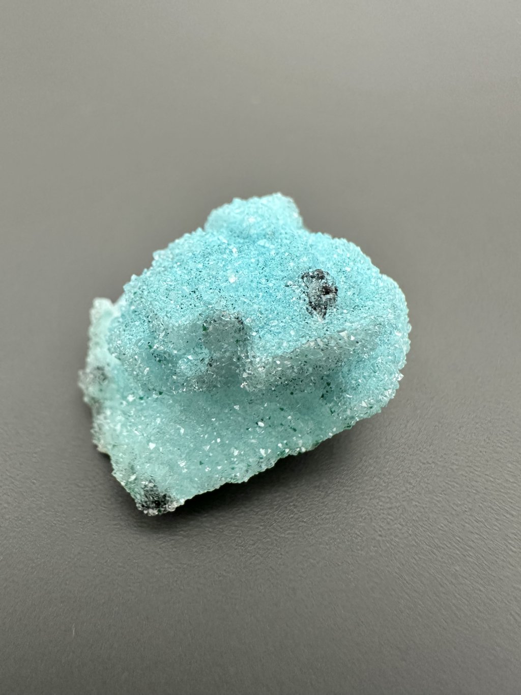 Chrysocolla typically has a matte to vitreous luster and a hardness of 2.5 to 3.5 on the Mohs scale, making it relatively soft. In nature, it appears in massive, earthy form, but can also form veins, crusts, or botryoidal (grape-like) aggregates. Due to its vivid color, it is often mistaken for turquoise, though it is softer and has different optical properties.