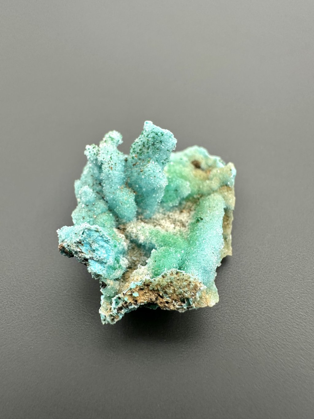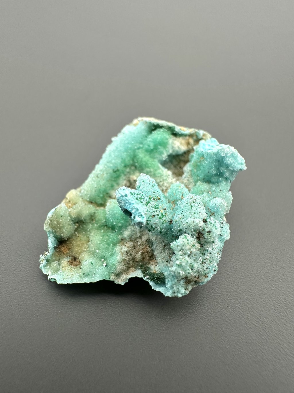 Chrysocolla typically has a matte to vitreous luster and a hardness of 2.5 to 3.5 on the Mohs scale, making it relatively soft. In nature, it appears in massive, earthy form, but can also form veins, crusts, or botryoidal (grape-like) aggregates. Due to its vivid color, it is often mistaken for turquoise, though it is softer and has different optical properties.