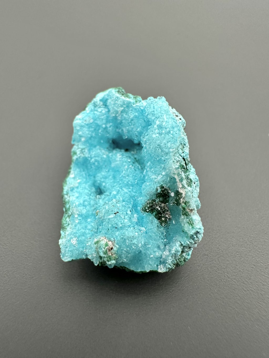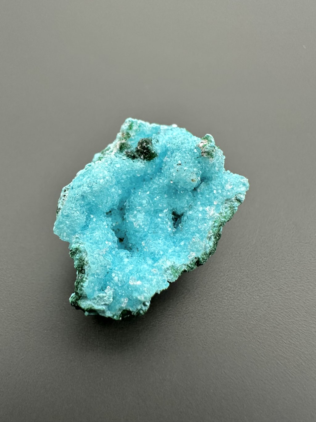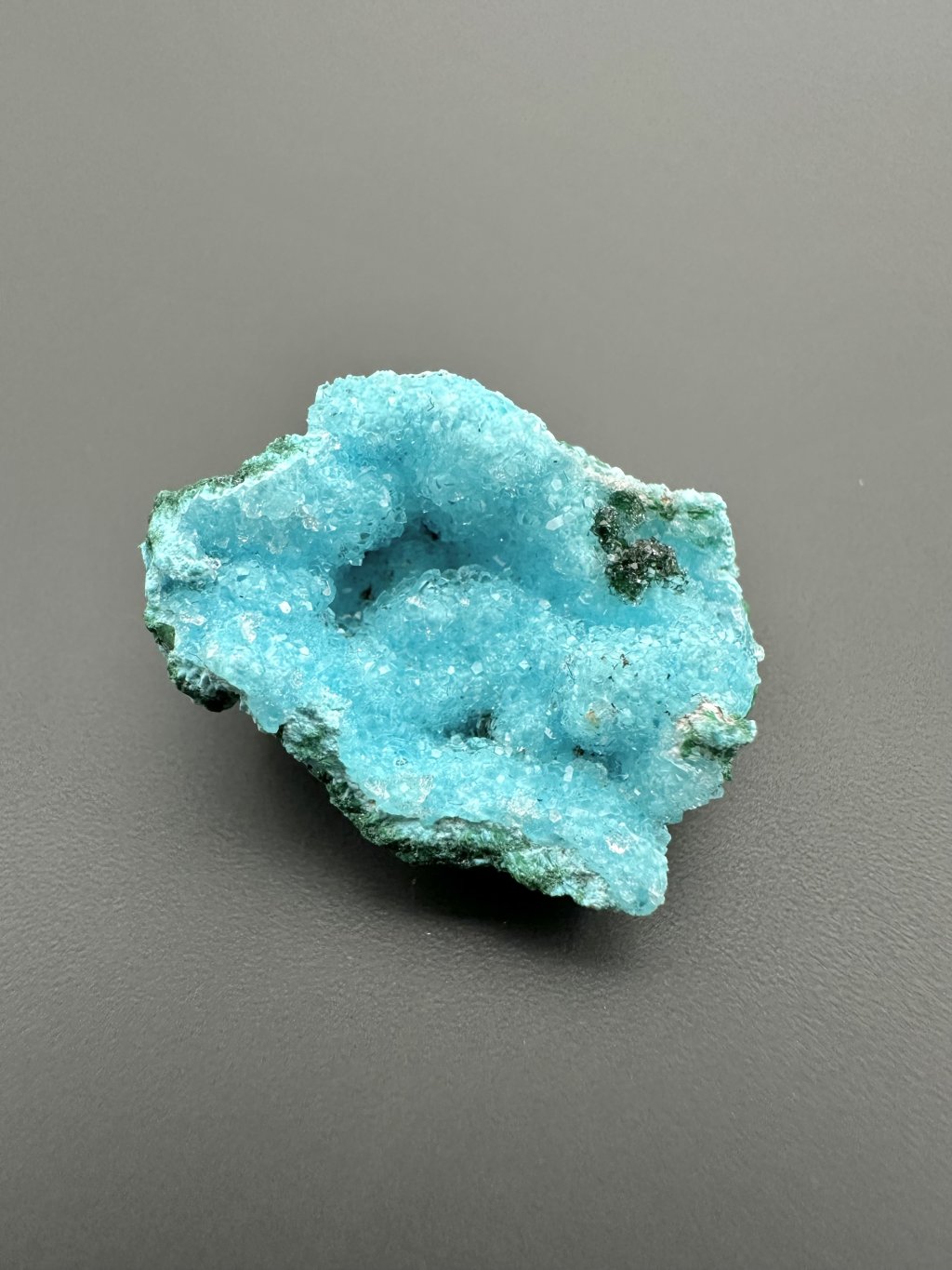 Chrysocolla is a copper-based mineral known for its intense blue to blue-green color. It forms in oxidized zones of copper deposits and is often found alongside other colorful minerals such as malachite, azurite, cuprite, or limonite. Its chemical composition is a complex silicate with a variable water content.