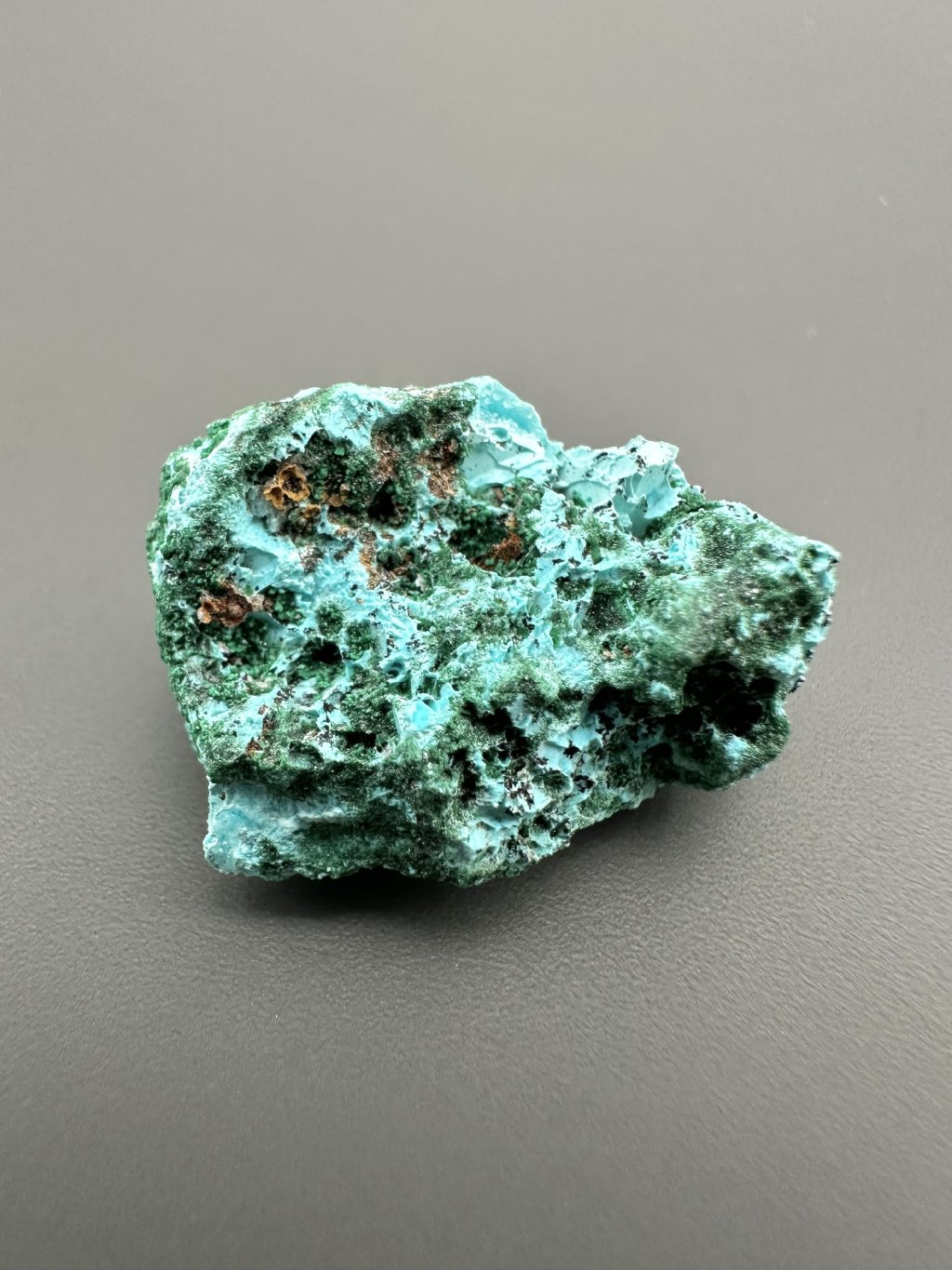 Chrysocolla typically has a matte to vitreous luster and a hardness of 2.5 to 3.5 on the Mohs scale, making it relatively soft. In nature, it appears in massive, earthy form, but can also form veins, crusts, or botryoidal (grape-like) aggregates. Due to its vivid color, it is often mistaken for turquoise, though it is softer and has different optical properties.