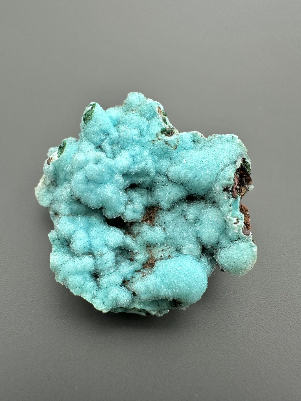 Chrysocolla typically has a matte to vitreous luster and a hardness of 2.5 to 3.5 on the Mohs scale, making it relatively soft. In nature, it appears in massive, earthy form, but can also form veins, crusts, or botryoidal (grape-like) aggregates. Due to its vivid color, it is often mistaken for turquoise, though it is softer and has different optical properties.