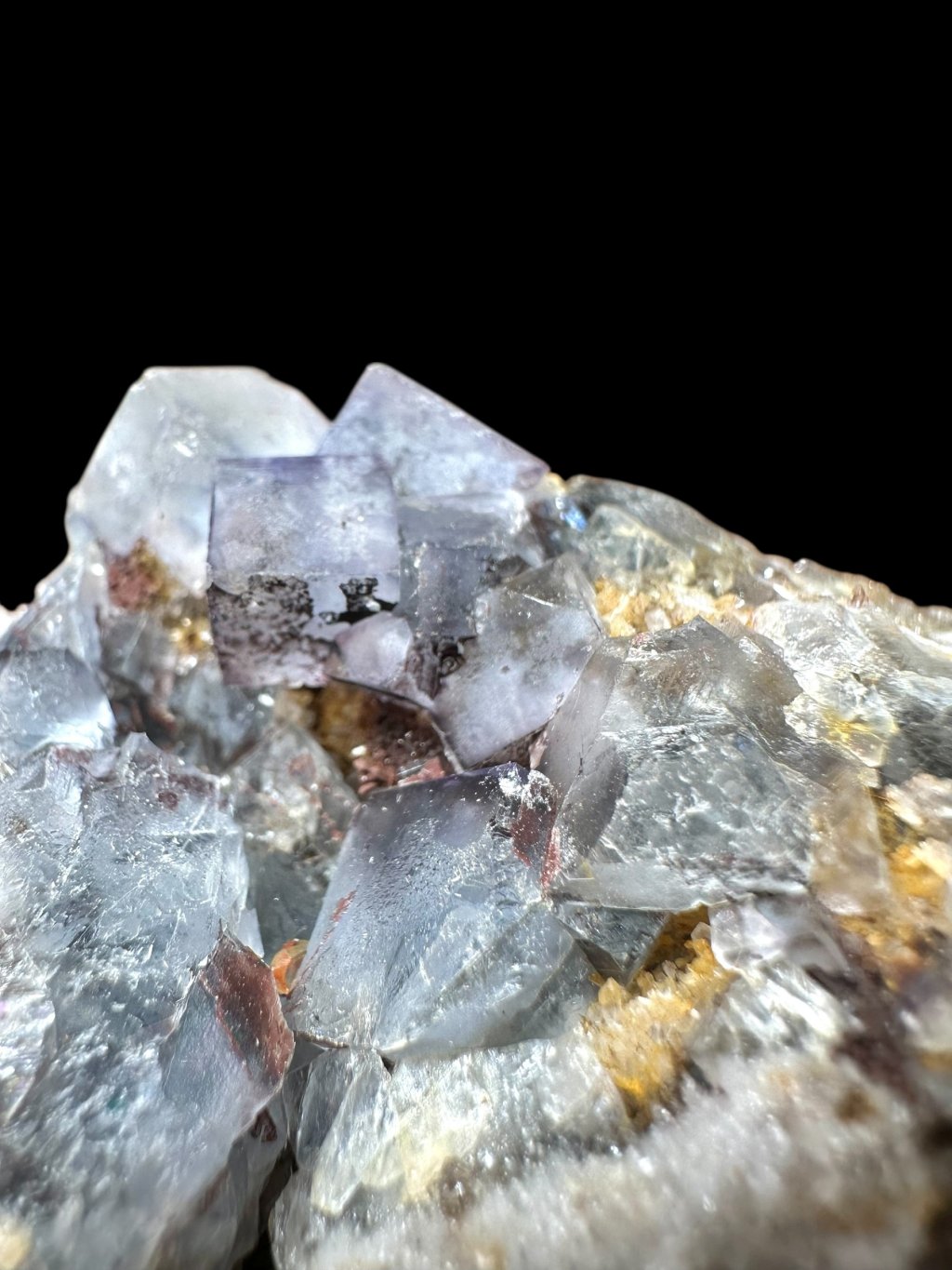 Fluorites from Tinejdad show a wide range of colors, from light purple and grayish-purple to greenish and honey-colored hues. The color often changes depending on the angle of view or lighting conditions. The crystals are mostly cubic in shape, sometimes with subtle zonal transitions or inclusions of other minerals.