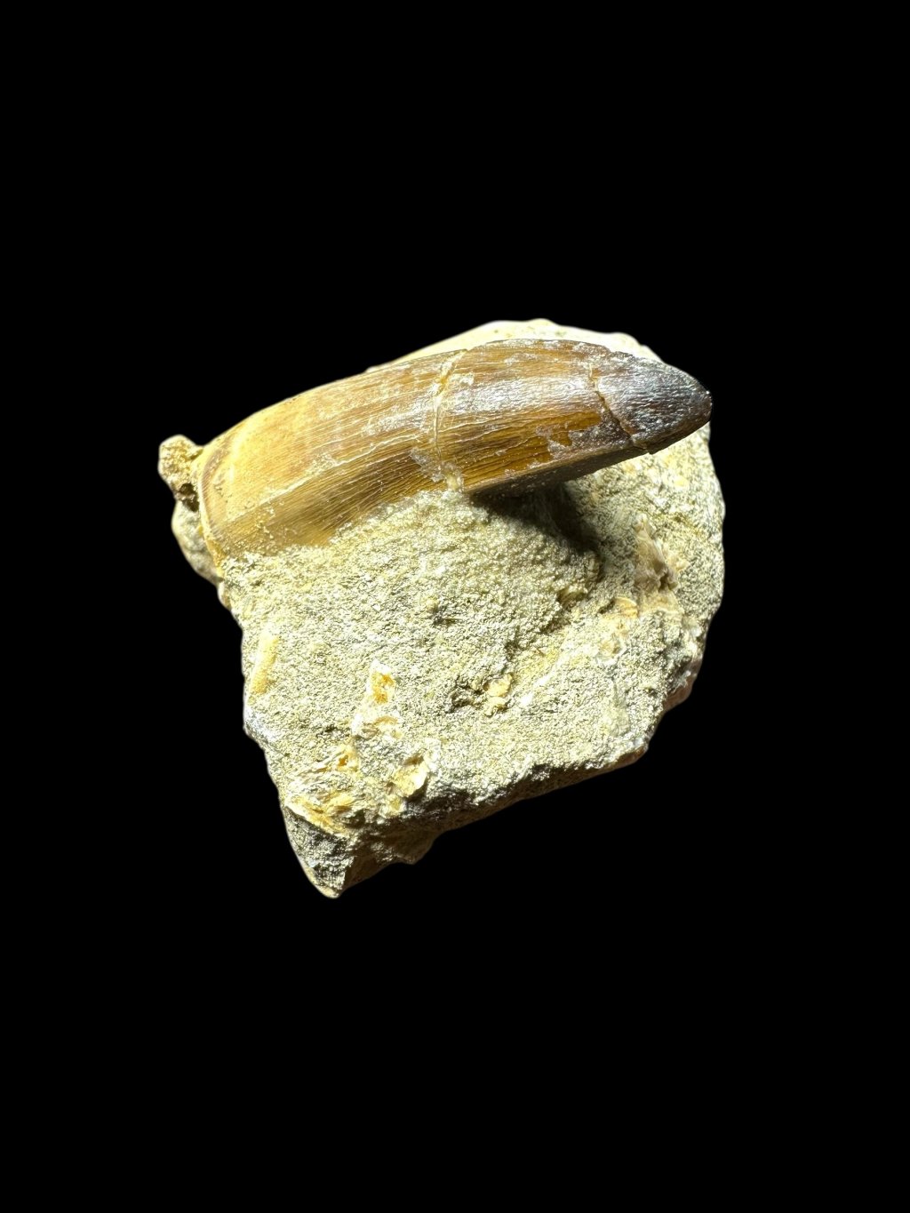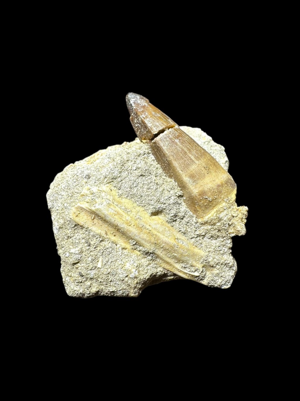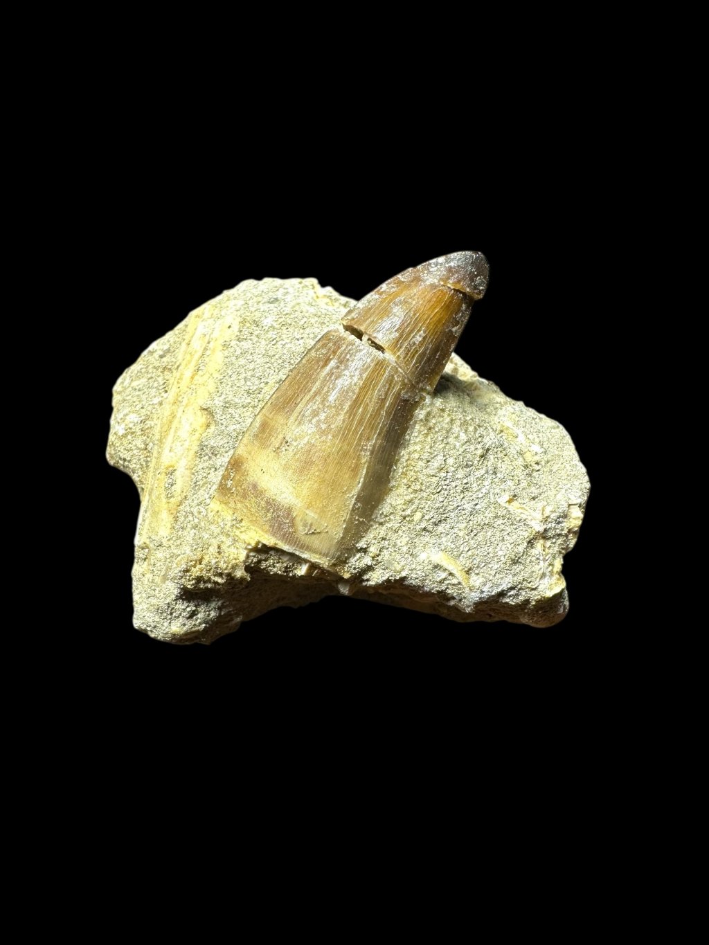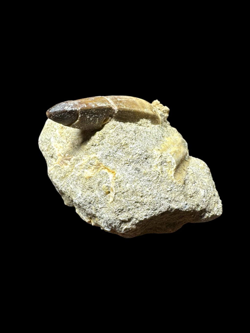 The tooth is in its original condition, not glued, and is set in the original host rock, which may also contain other fossil remains, such as fish bones or vertebrae.