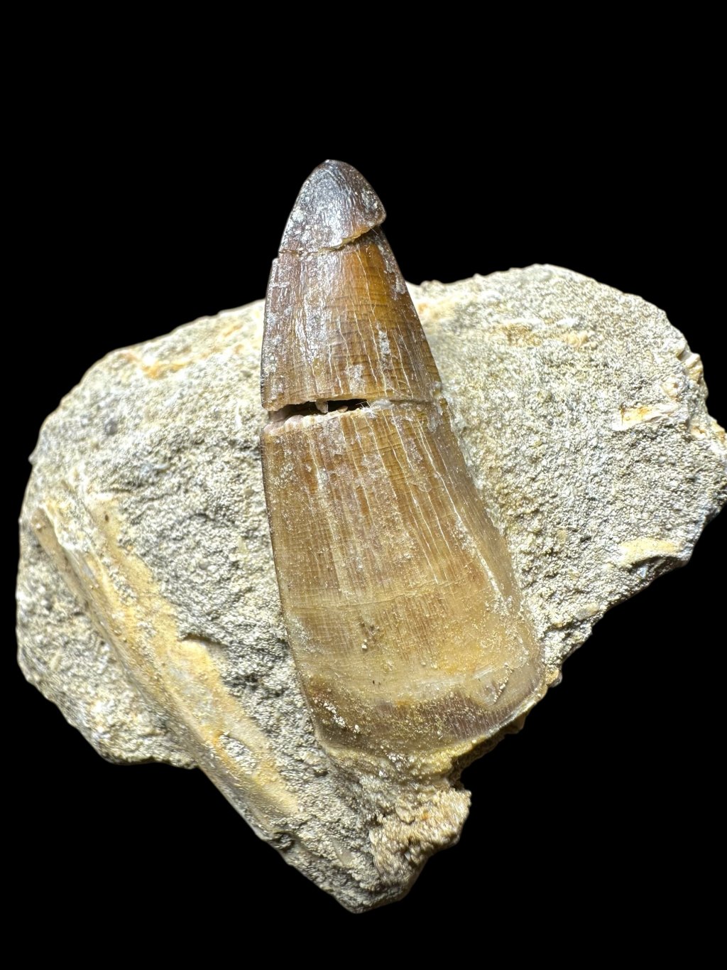 Mosasaur teeth were strong, conical, and sharp, perfectly adapted for grasping and crushing prey. Their surface was often finely ridged, improving strength and durability while hunting. The teeth were not designed for chewing, but for quickly grabbing, piercing, and swallowing prey – such as fish, ammonites, or smaller marine reptiles.
