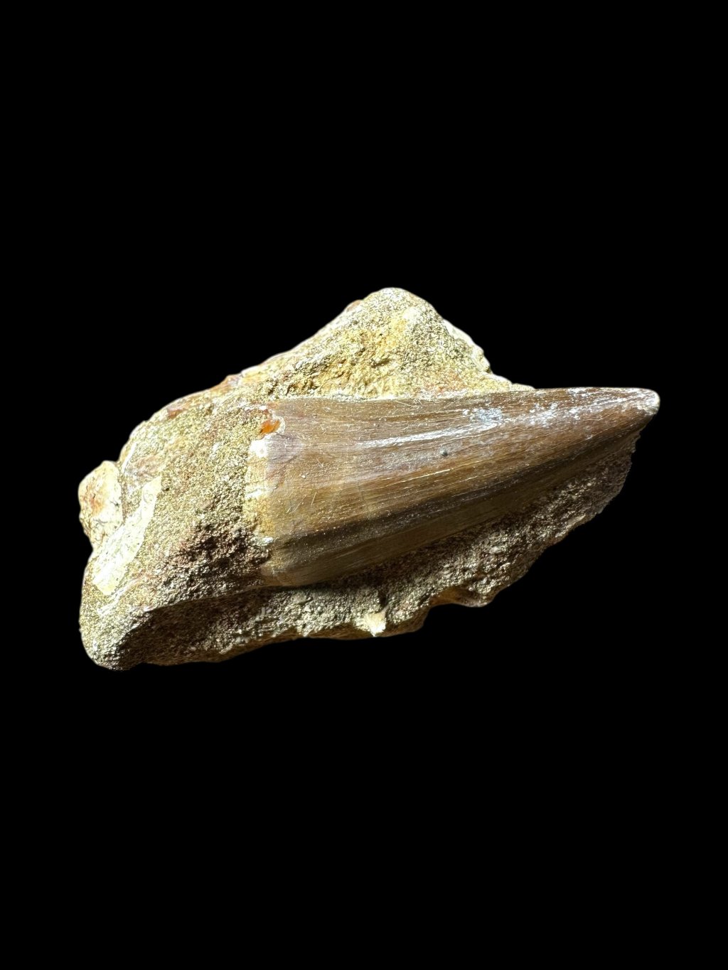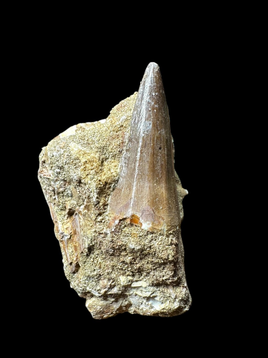 The tooth is in its original condition, not glued, and is set in the original host rock, which may also contain other fossil remains, such as fish bones or vertebrae.