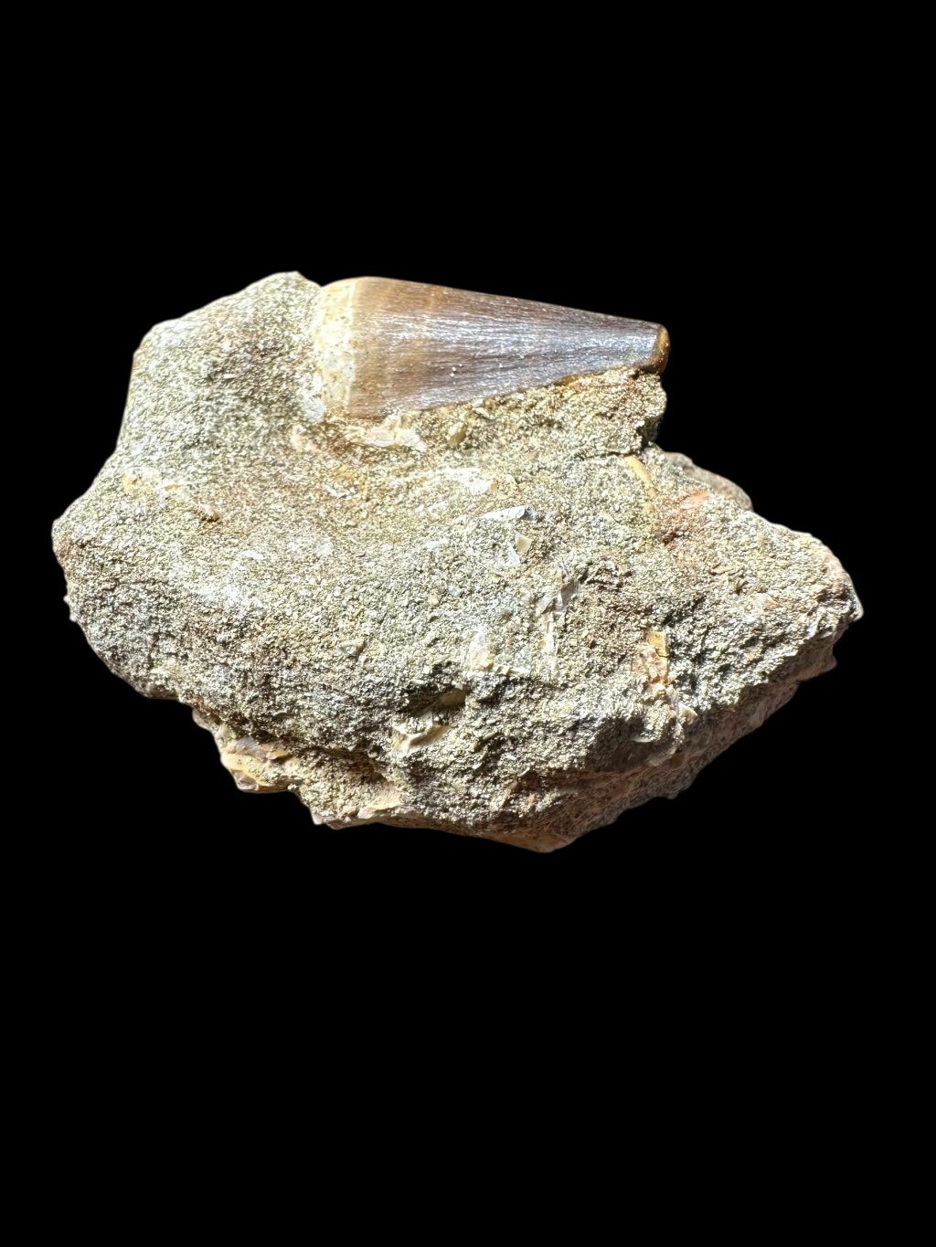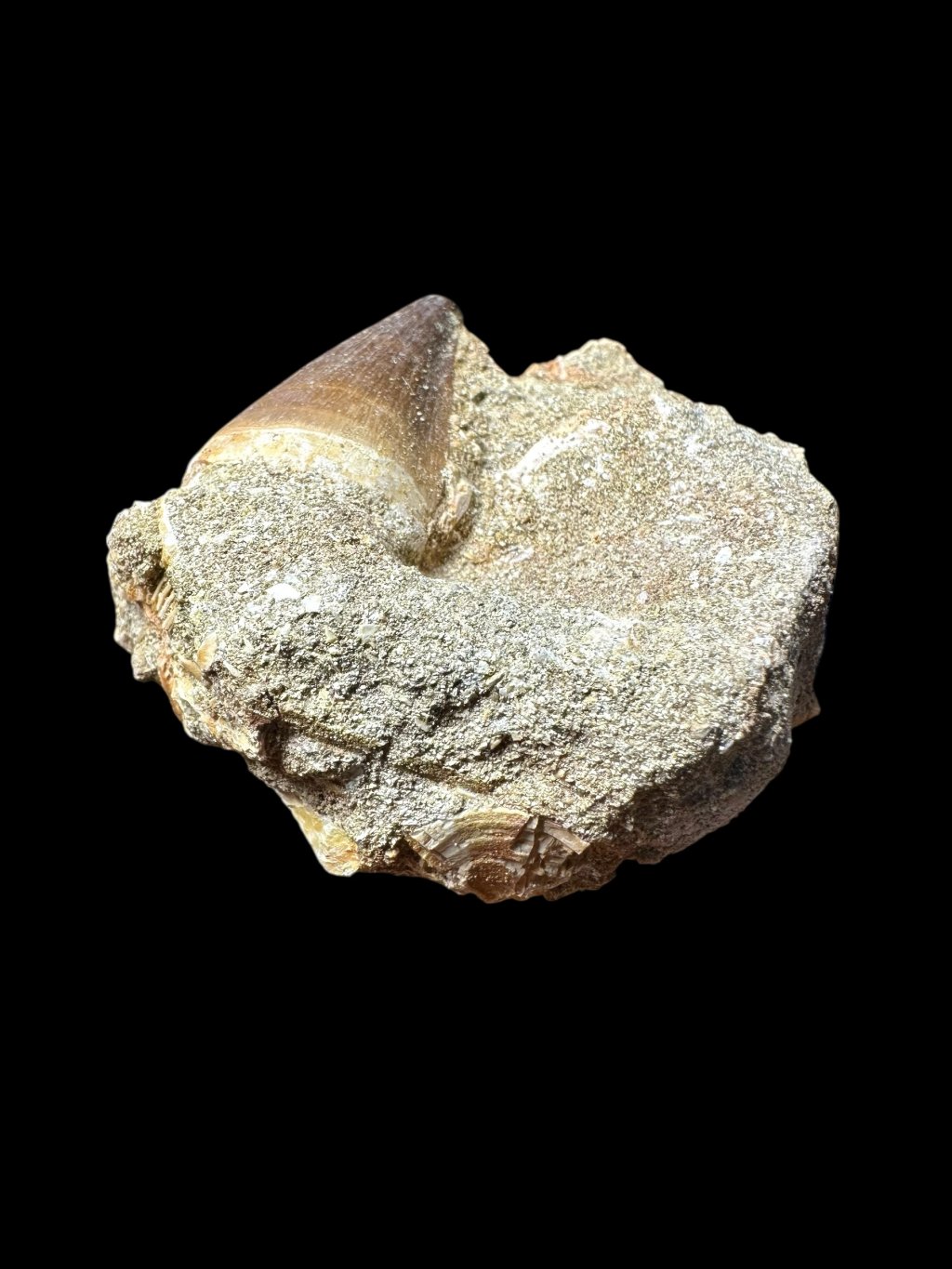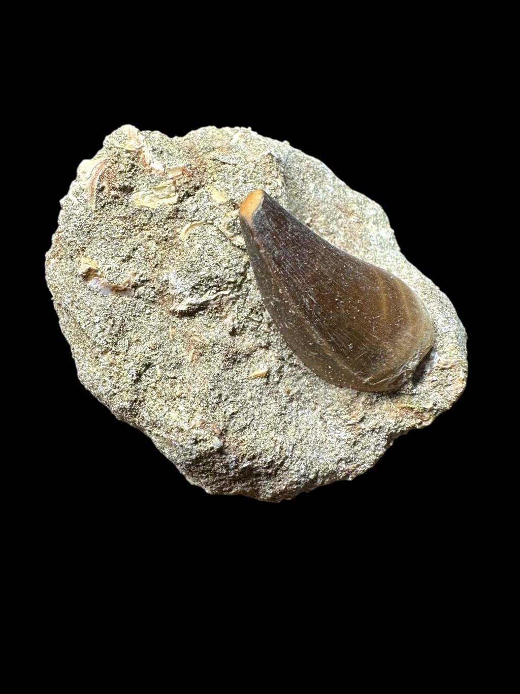 The tooth is in its original condition, not glued, and is set in the original host rock, which may also contain other fossil remains, such as fish bones or vertebrae.