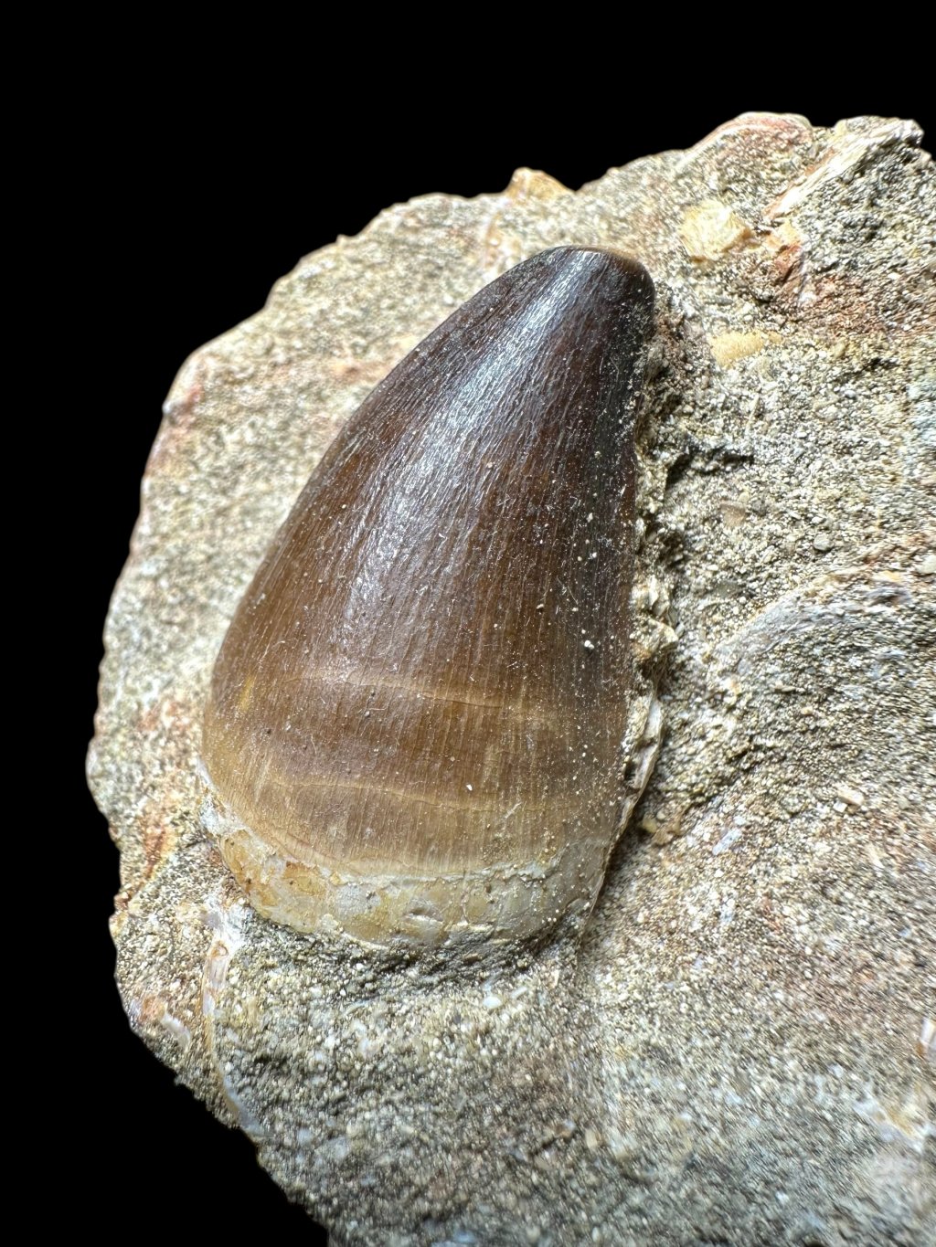 Each tooth was set in a separate socket and was regularly replaced throughout its life – similar to modern crocodiles. Therefore, mosasaur fossil teeth are relatively common, but complete specimens with part of the jaw or in host rock are much rarer and more valuable.