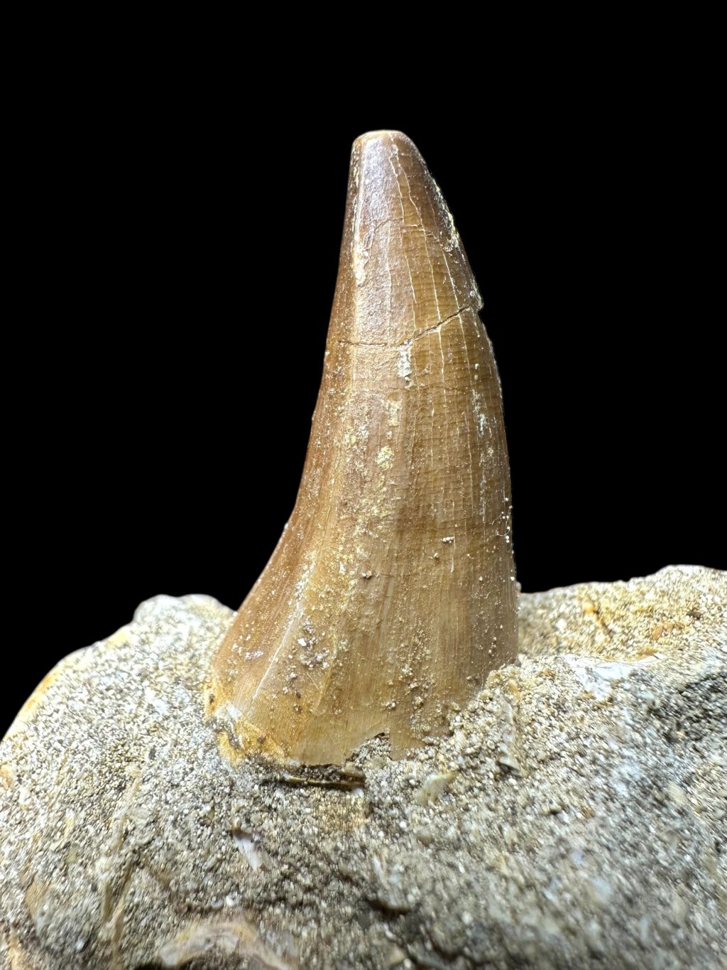 The tooth is in its original condition, not glued, and is set in the original host rock, which may also contain other fossil remains, such as fish bones or vertebrae.