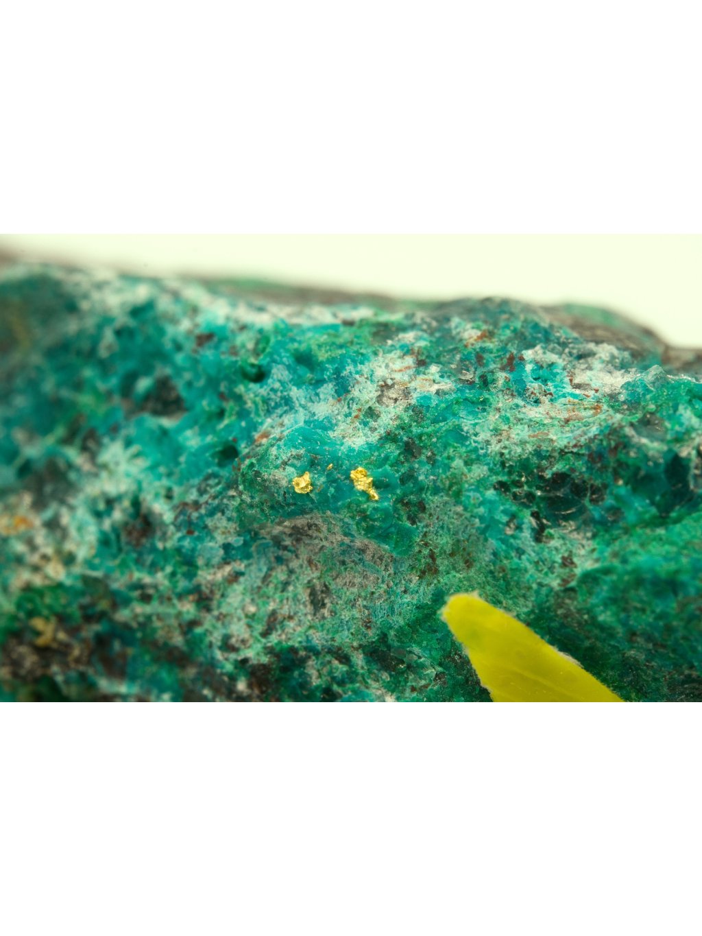 This specimen represents a contrasting example of gold on a blue matrix, primarily composed of shattuckite.