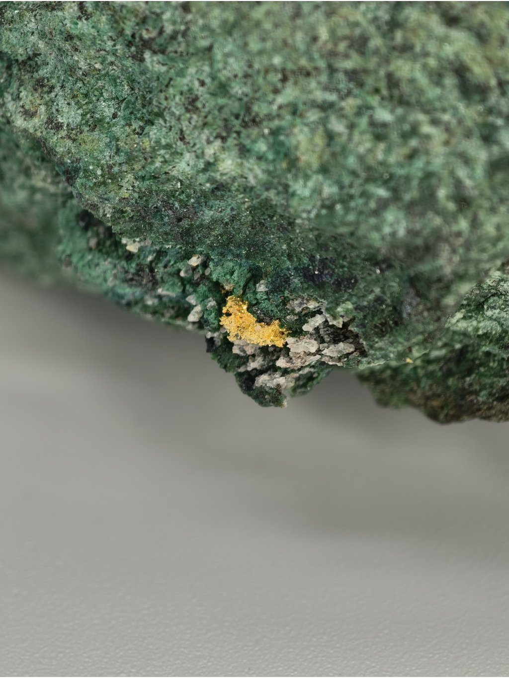 This specimen represents a contrasting example of gold on a vivid green matrix primarily composed of malachite.