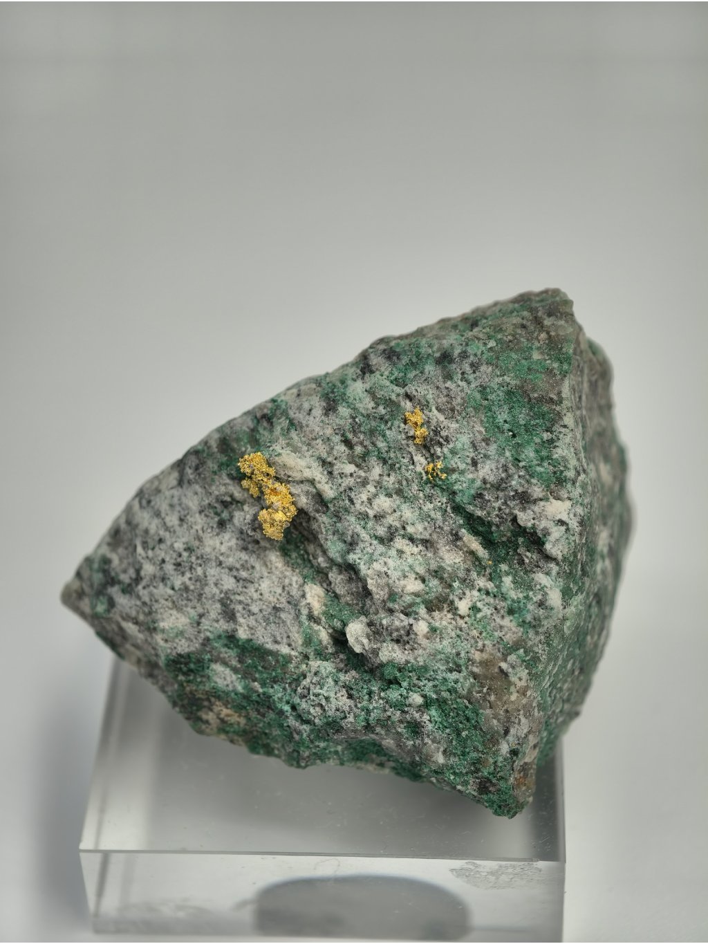 This specimen represents a contrasting example of gold on a vivid green matrix primarily composed of malachite.