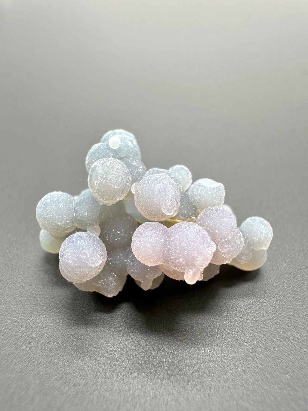 Grape chalcedony is a relatively new discovery in the mineral market. The first samples were found in 2016 on the Indonesian island of Sulawesi, specifically in the Manakarra area. Grape chalcedony is a variety of quartz and is characterized by characteristic spherical aggregates called spherulites, which are formed by precipitation from silica-rich (SiO₂) jelly-like solutions. These spherical structures, often up to 1 cm in size, are made up of fine filaments of the same length that are closely packed together. The individual spheres are often fused together or to the underlying rock, forming a shape resembling a grape, giving rise to their name.
