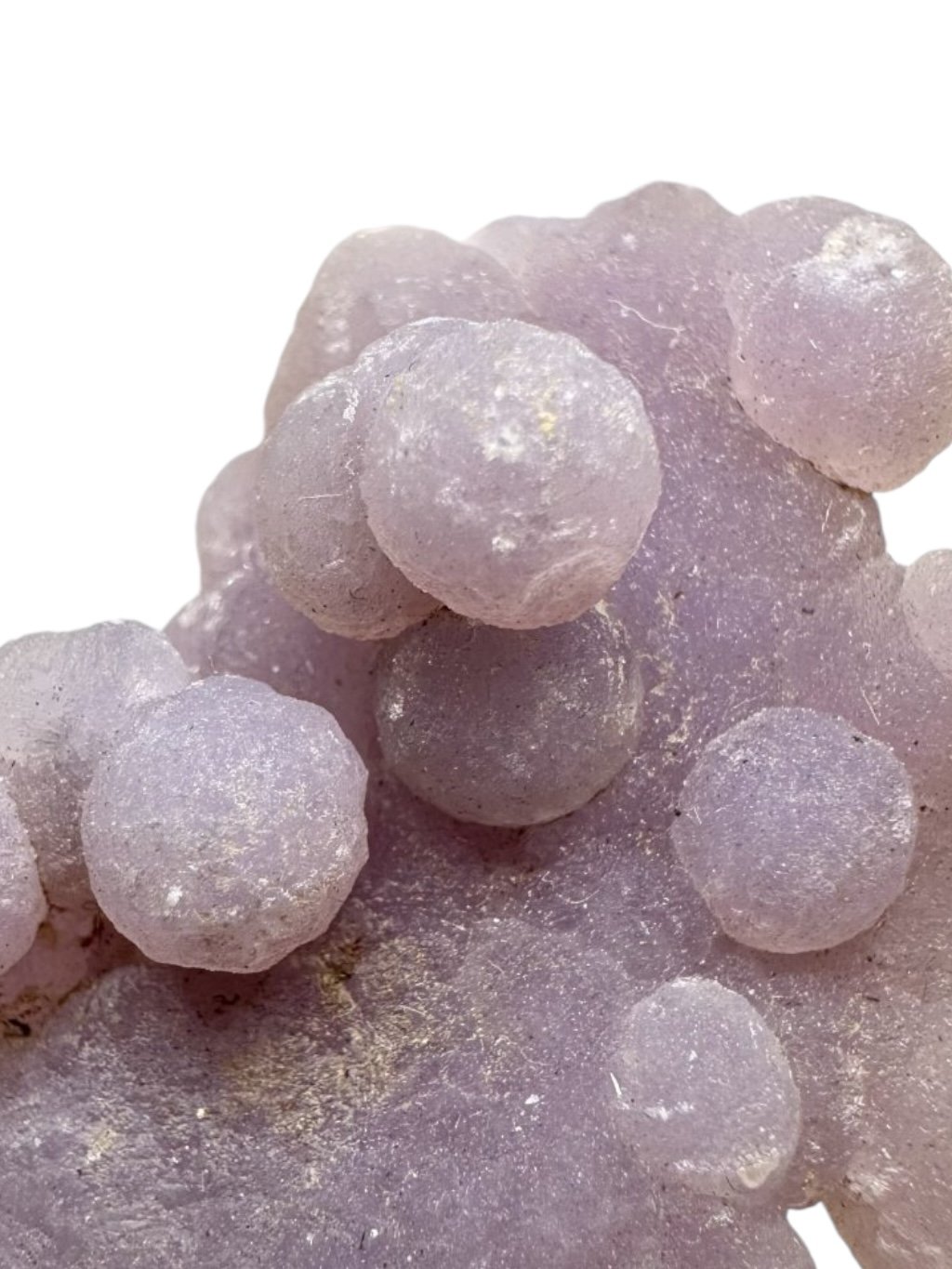 Grape chalcedony is a relatively new discovery in the mineral market. The first samples were found in 2016 on the Indonesian island of Sulawesi, specifically in the Manakarra area. Grape chalcedony is a variety of quartz and is characterized by characteristic spherical aggregates called spherulites, which are formed by precipitation from silica-rich (SiO₂) jelly-like solutions. These spherical structures, often up to 1 cm in size, are made up of fine filaments of the same length that are closely packed together. The individual spheres are often fused together or to the underlying rock, forming a shape resembling a grape, giving rise to their name.