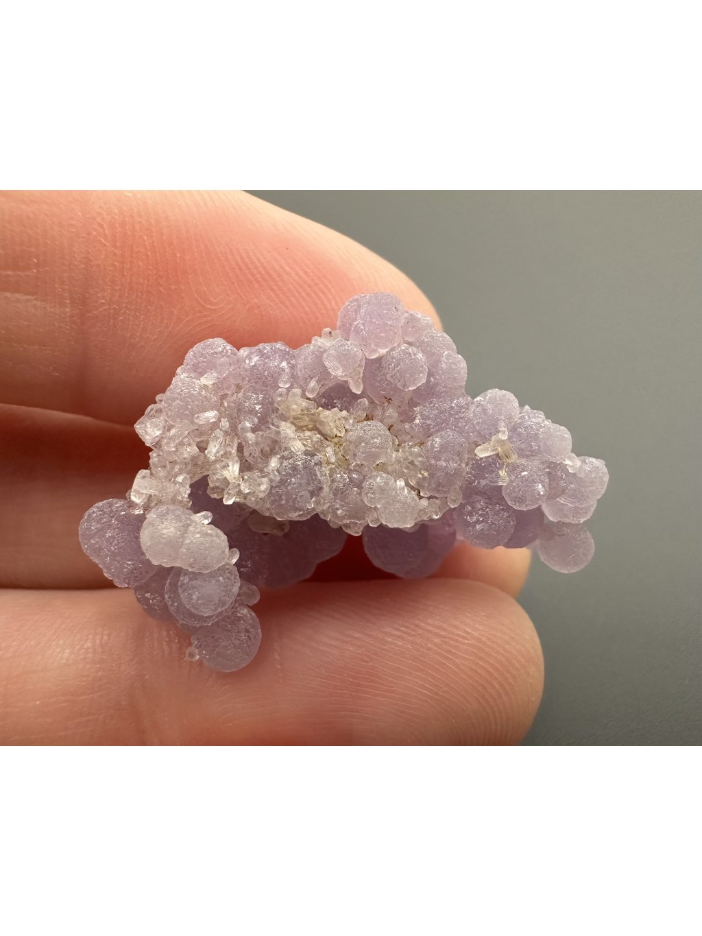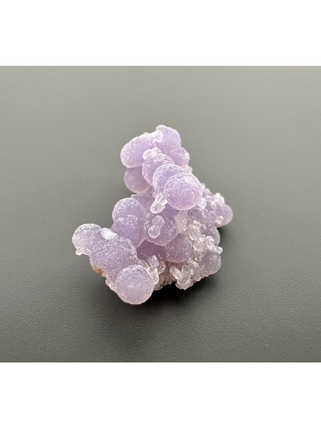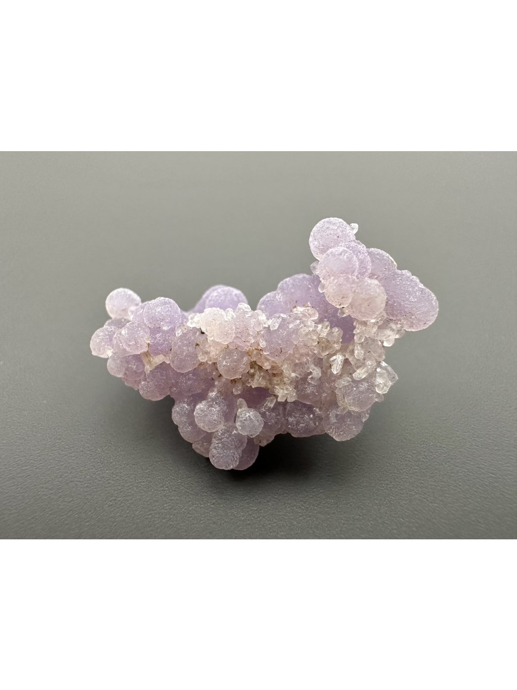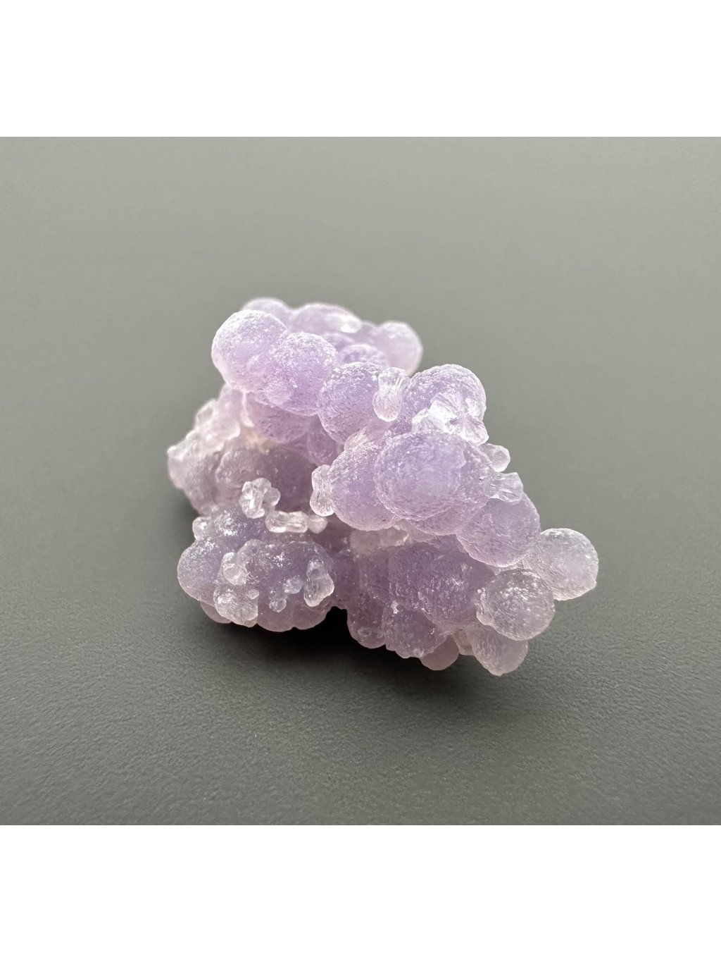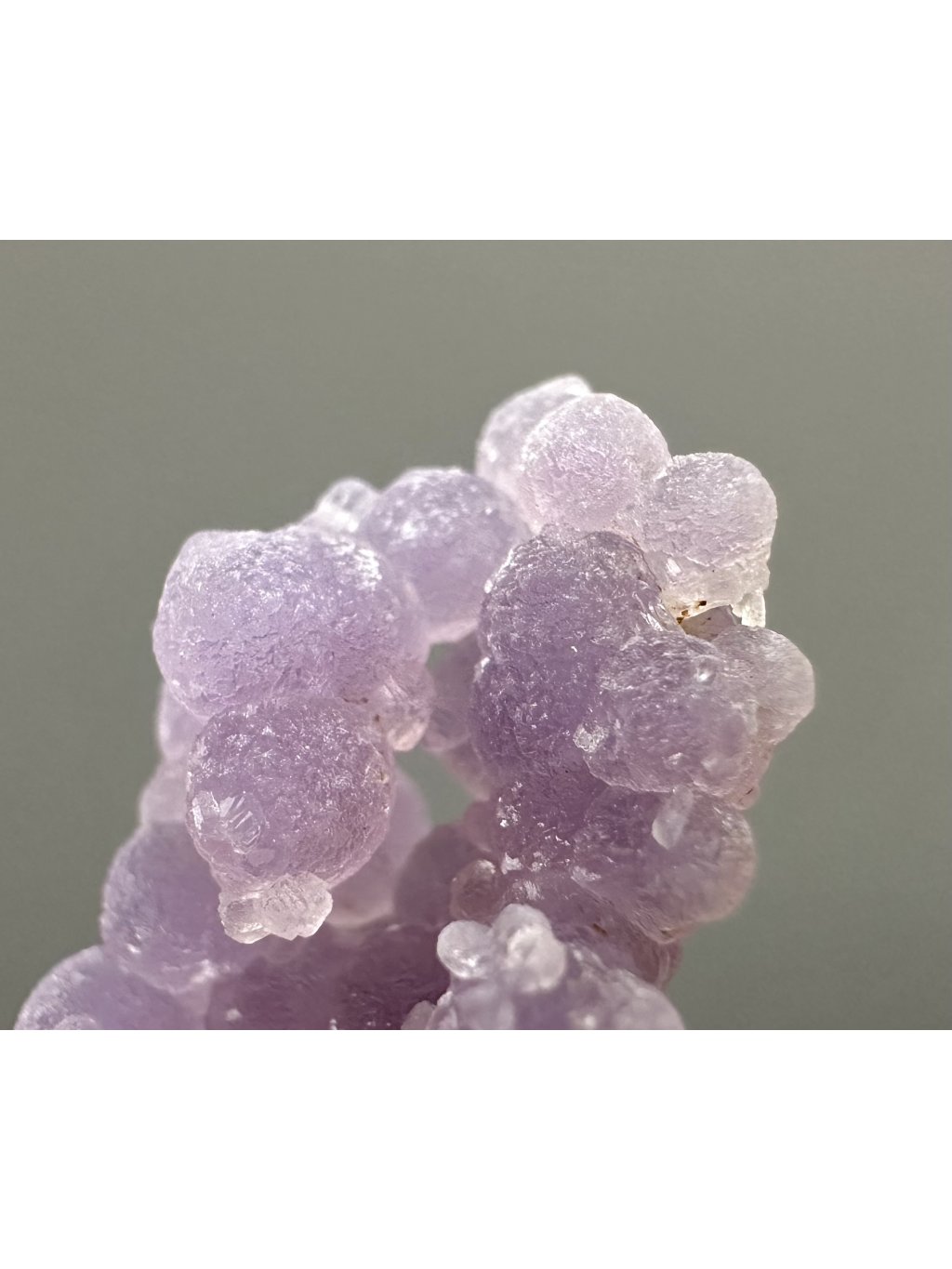 Grape chalcedony is a relatively new discovery in the mineral market. The first samples were found in 2016 on the Indonesian island of Sulawesi, specifically in the Manakarra area. Grape chalcedony is a variety of quartz and is characterized by characteristic spherical aggregates called spherulites, which are formed by precipitation from silica-rich (SiO₂) jelly-like solutions. These spherical structures, often up to 1 cm in size, are made up of fine filaments of the same length that are closely packed together. The individual spheres are often fused together or to the underlying rock, forming a shape resembling a grape, giving rise to their name.