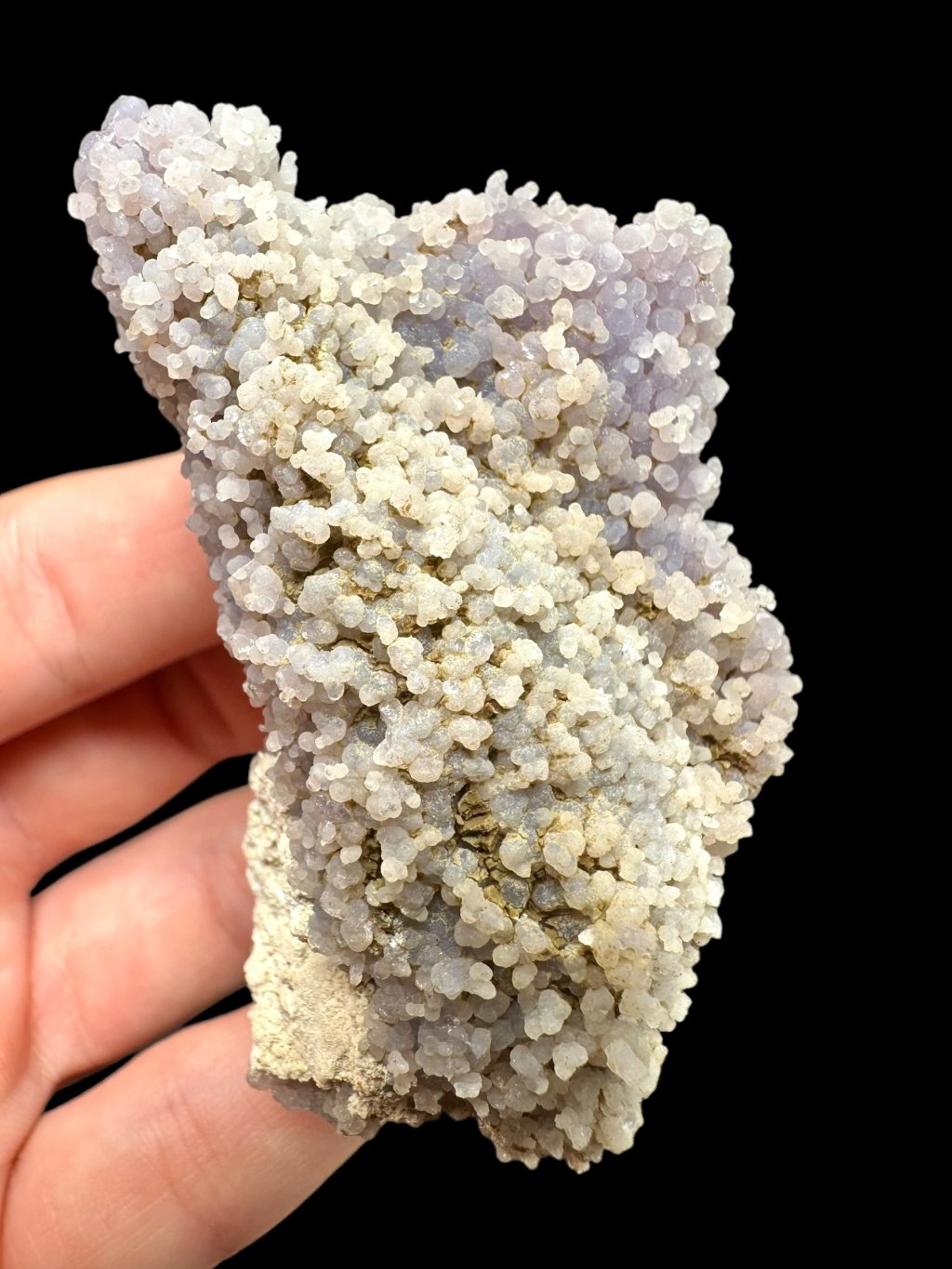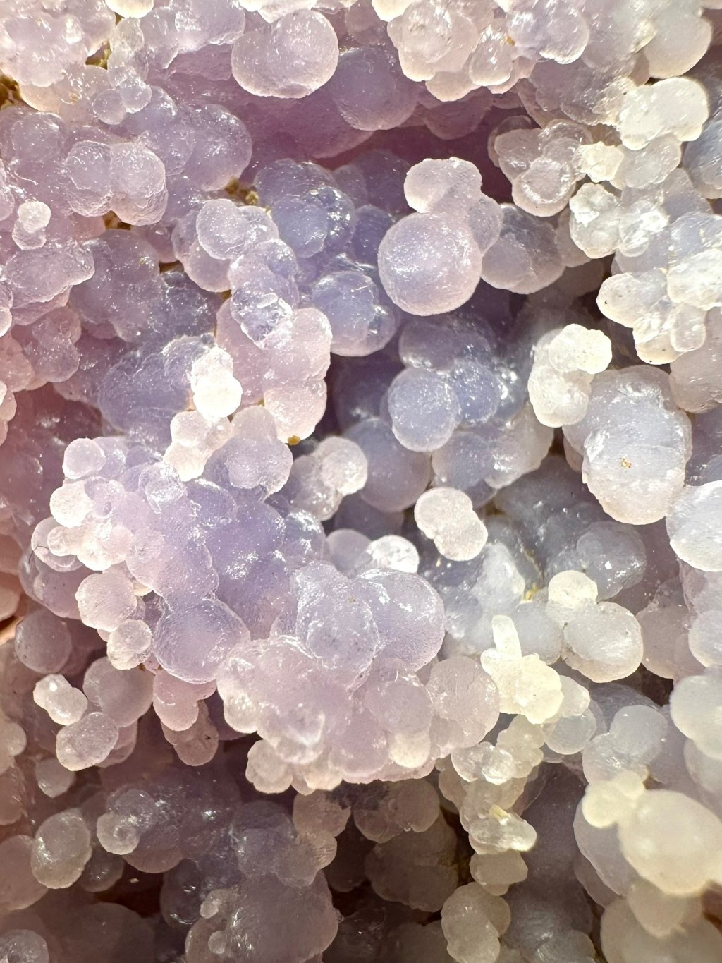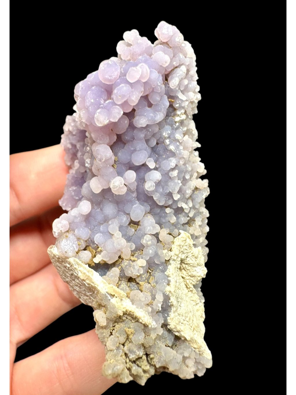 Grape chalcedony is a relatively new discovery in the mineral market. The first samples were found in 2016 on the Indonesian island of Sulawesi, specifically in the Manakarra area. Grape chalcedony is a variety of quartz and is characterized by characteristic spherical aggregates called spherulites, which are formed by precipitation from silica-rich (SiO₂) jelly-like solutions. These spherical structures, often up to 1 cm in size, are made up of fine filaments of the same length that are closely packed together. The individual spheres are often fused together or to the underlying rock, forming a shape resembling a grape, giving rise to their name.