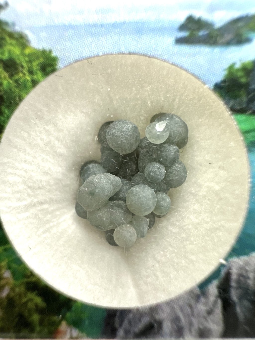 Grape chalcedony is a relatively new discovery in the mineral market. The first samples were found in 2016 on the Indonesian island of Sulawesi, specifically in the Manakarra area. Grape chalcedony is a variety of quartz and is characterized by characteristic spherical aggregates called spherulites, which are formed by precipitation from silica-rich (SiO₂) jelly-like solutions. These spherical structures, often up to 1 cm in size, are made up of fine filaments of the same length that are closely packed together. The individual spheres are often fused together or to the underlying rock, forming a shape resembling a grape, giving rise to their name.