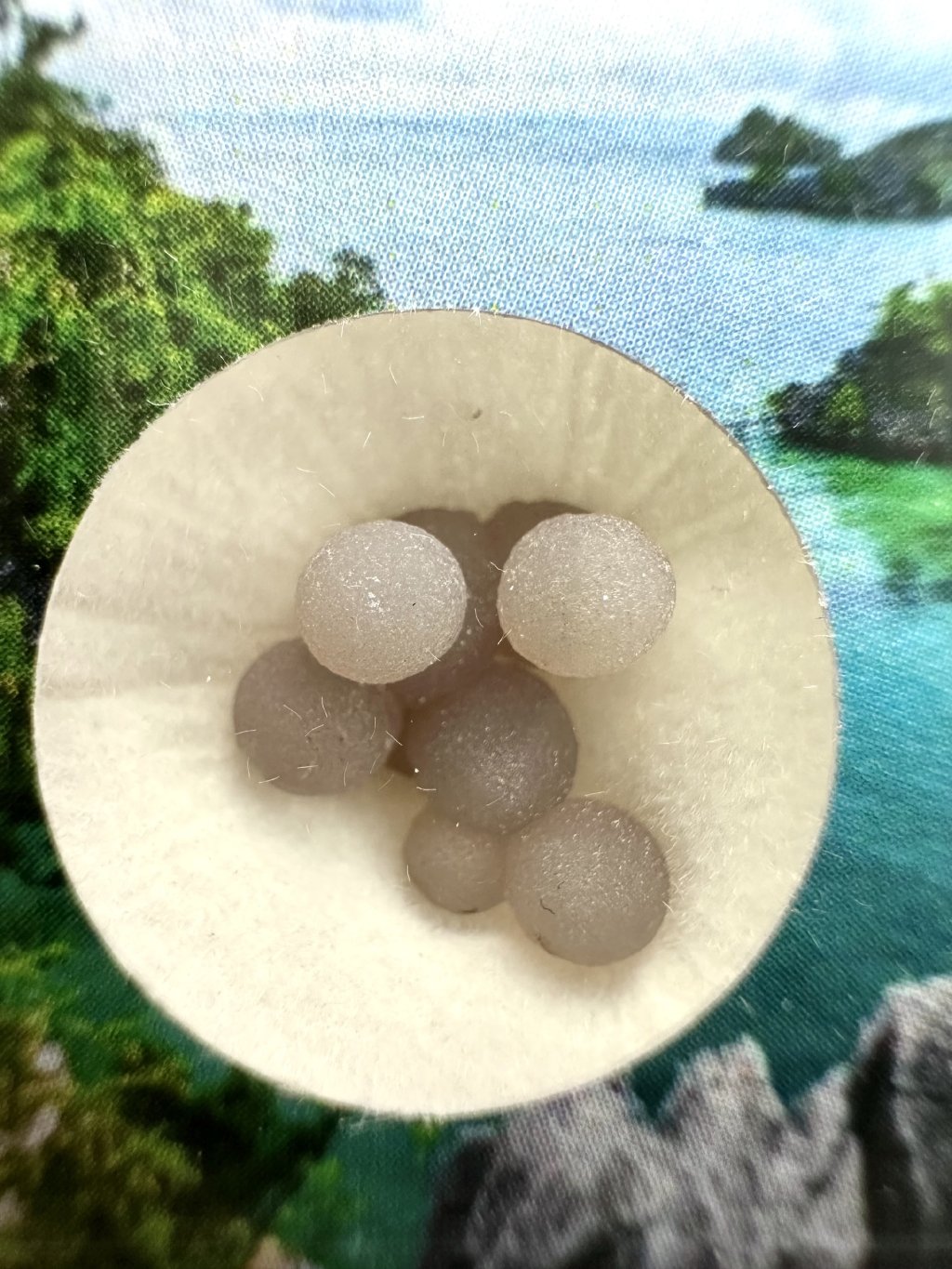 Grape chalcedony is a relatively new discovery in the mineral market. The first samples were found in 2016 on the Indonesian island of Sulawesi, specifically in the Manakarra area. Grape chalcedony is a variety of quartz and is characterized by characteristic spherical aggregates called spherulites, which are formed by precipitation from silica-rich (SiO₂) jelly-like solutions. These spherical structures, often up to 1 cm in size, are made up of fine filaments of the same length that are closely packed together. The individual spheres are often fused together or to the underlying rock, forming a shape resembling a grape, giving rise to their name.