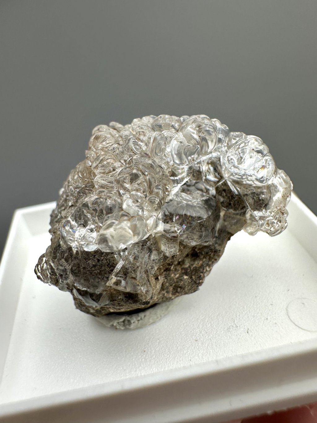 Hyalite, also known as glass opal, is a variety of opal characterized by its clear, colorless to slightly colored texture and characteristic glassy luster. This mineral is composed of silica (SiO₂) and contains water, which gives it its unique properties. Hyalite is formed by hydrothermal processes near the Earth's surface, often in the cavities of igneous rocks such as basalt. In the Czech Republic, there is an important deposit of hyalite in the vicinity of Valec, where it occurs as grape-like or stalactite-like aggregates.