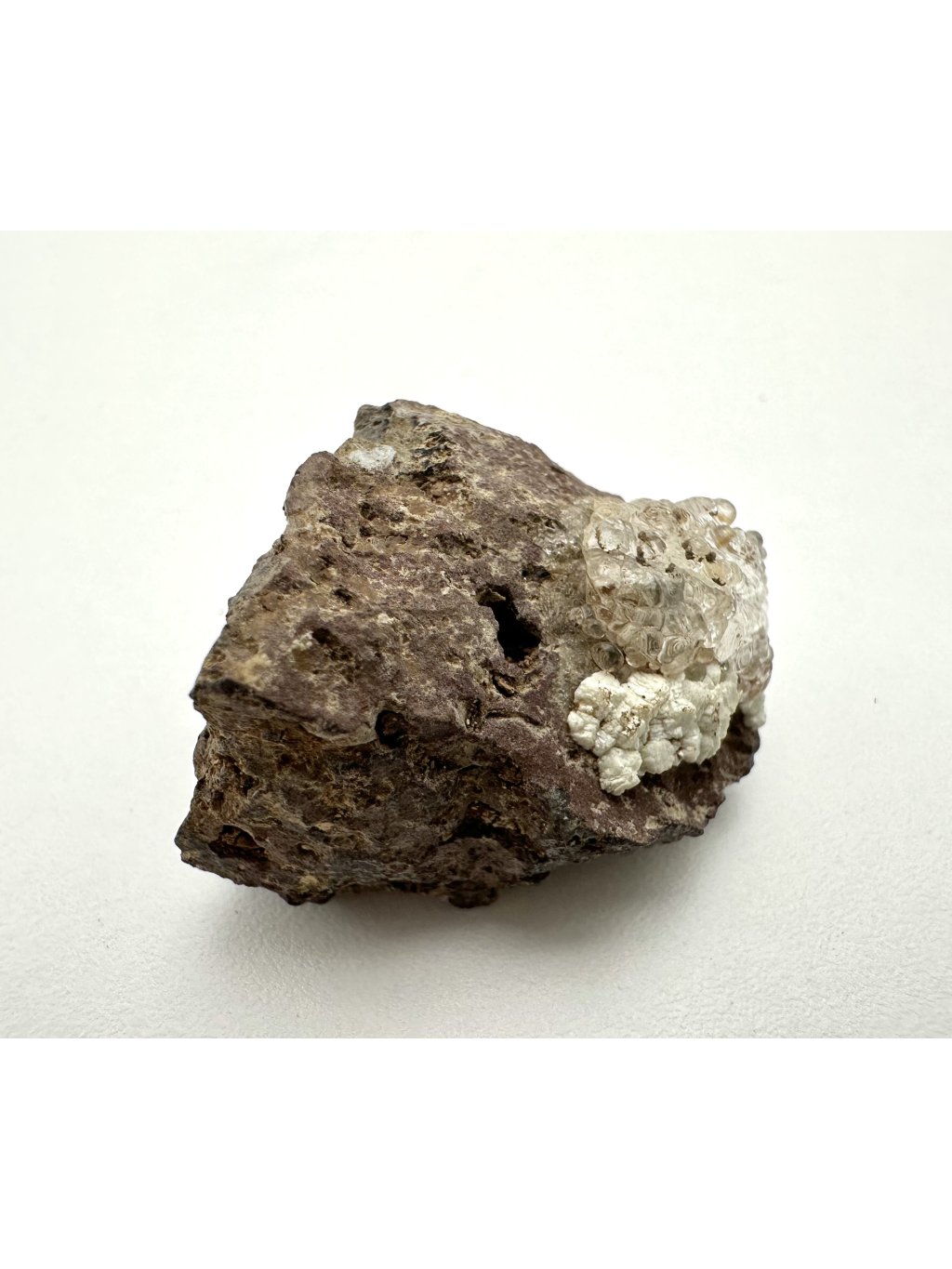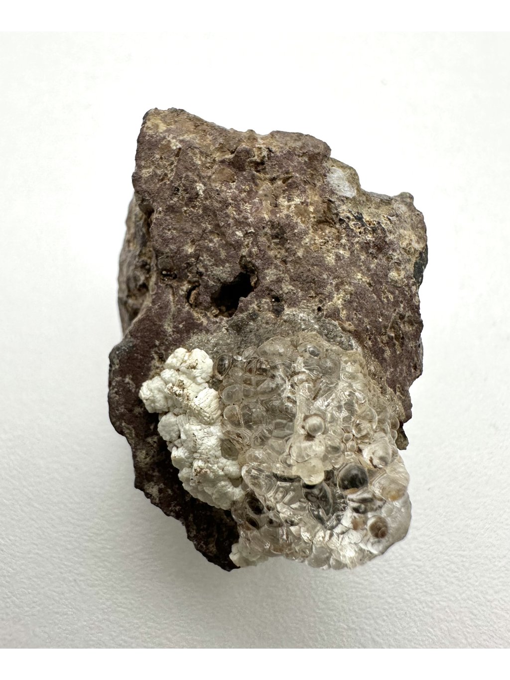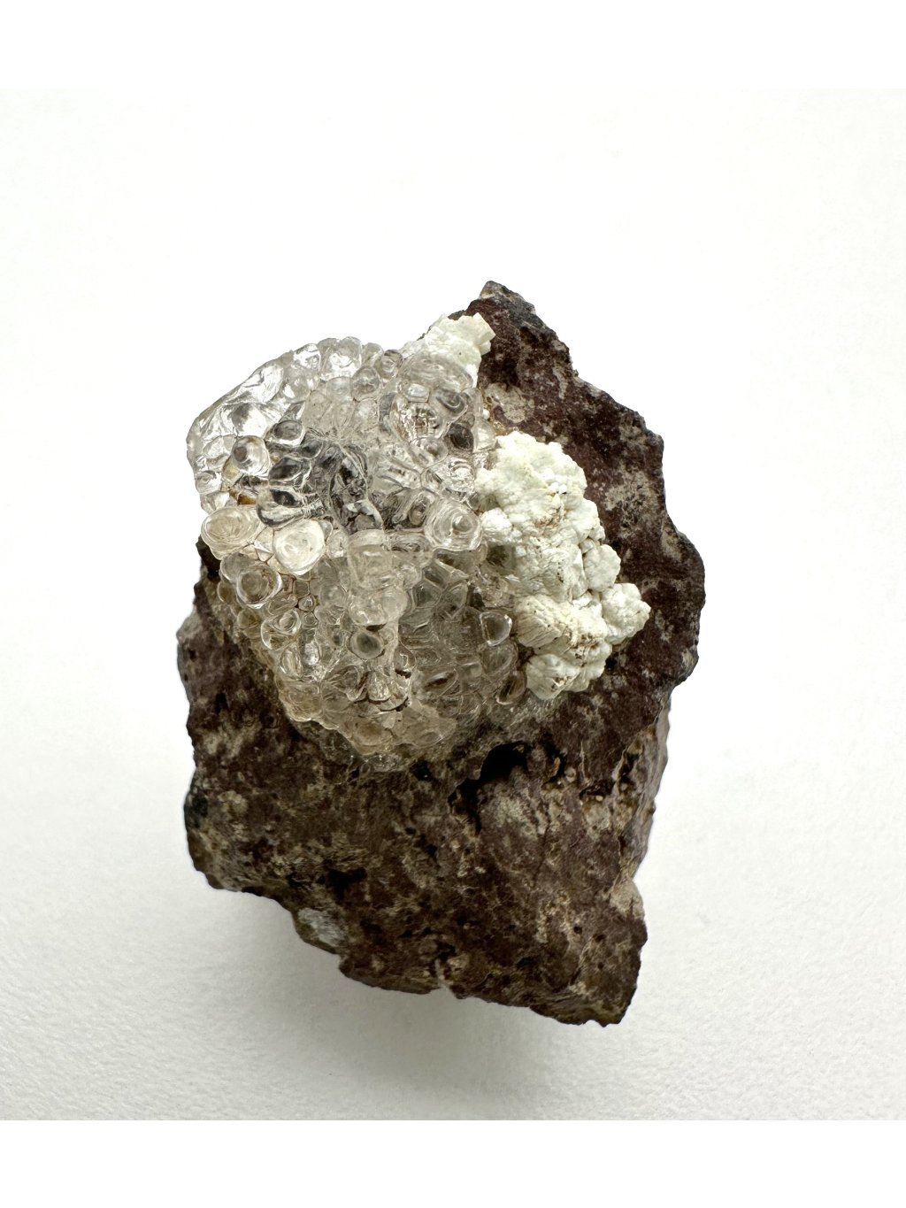 Hyalite, also known as glass opal, is a variety of opal characterized by its clear, colorless to slightly colored texture and characteristic glassy luster. This mineral is composed of silica (SiO₂) and contains water, which gives it its unique properties. Hyalite is formed by hydrothermal processes near the Earth's surface, often in the cavities of igneous rocks such as basalt. In the Czech Republic, there is an important deposit of hyalite in the vicinity of Valec, where it occurs as grape-like or stalactite-like aggregates.
