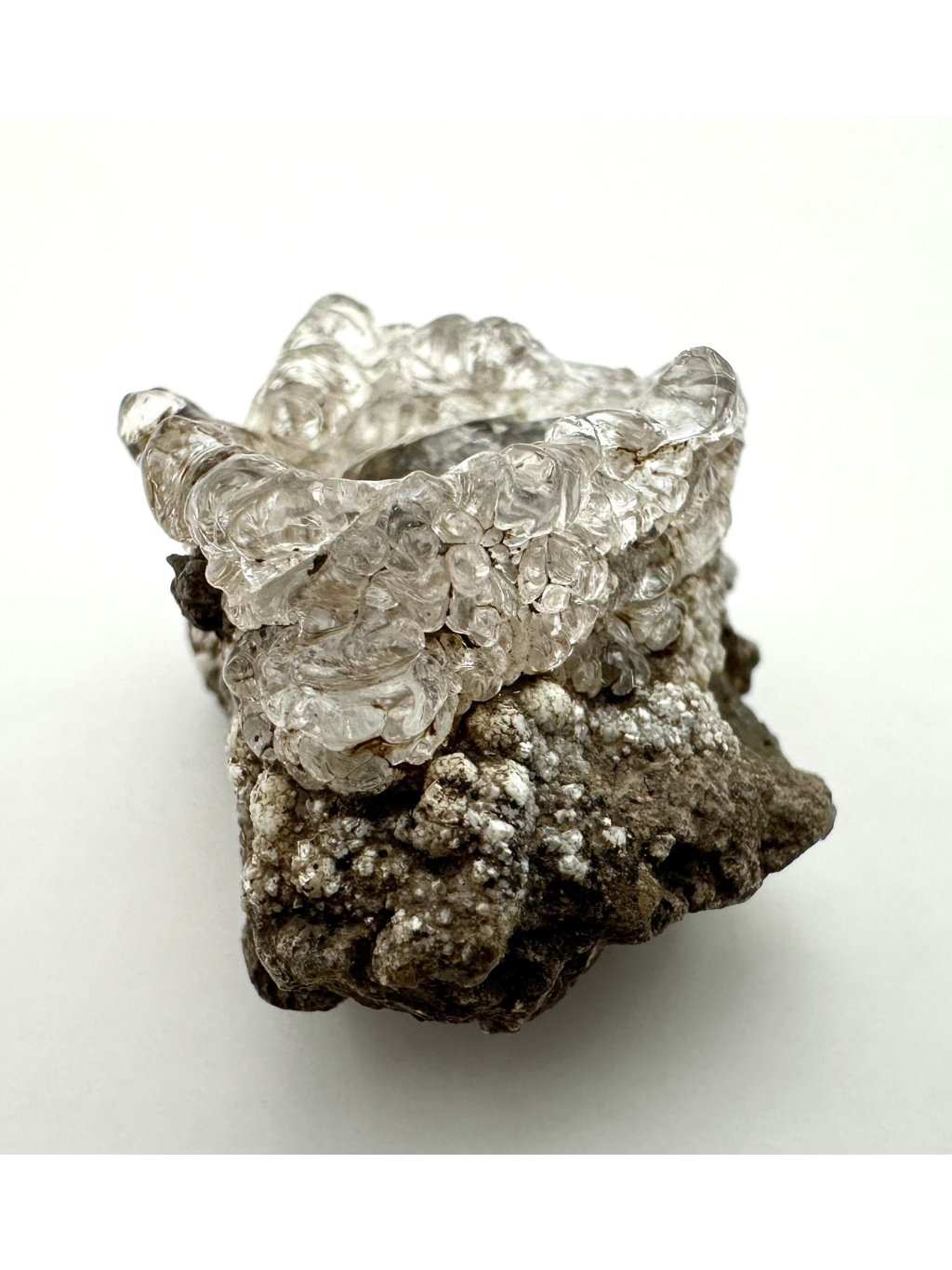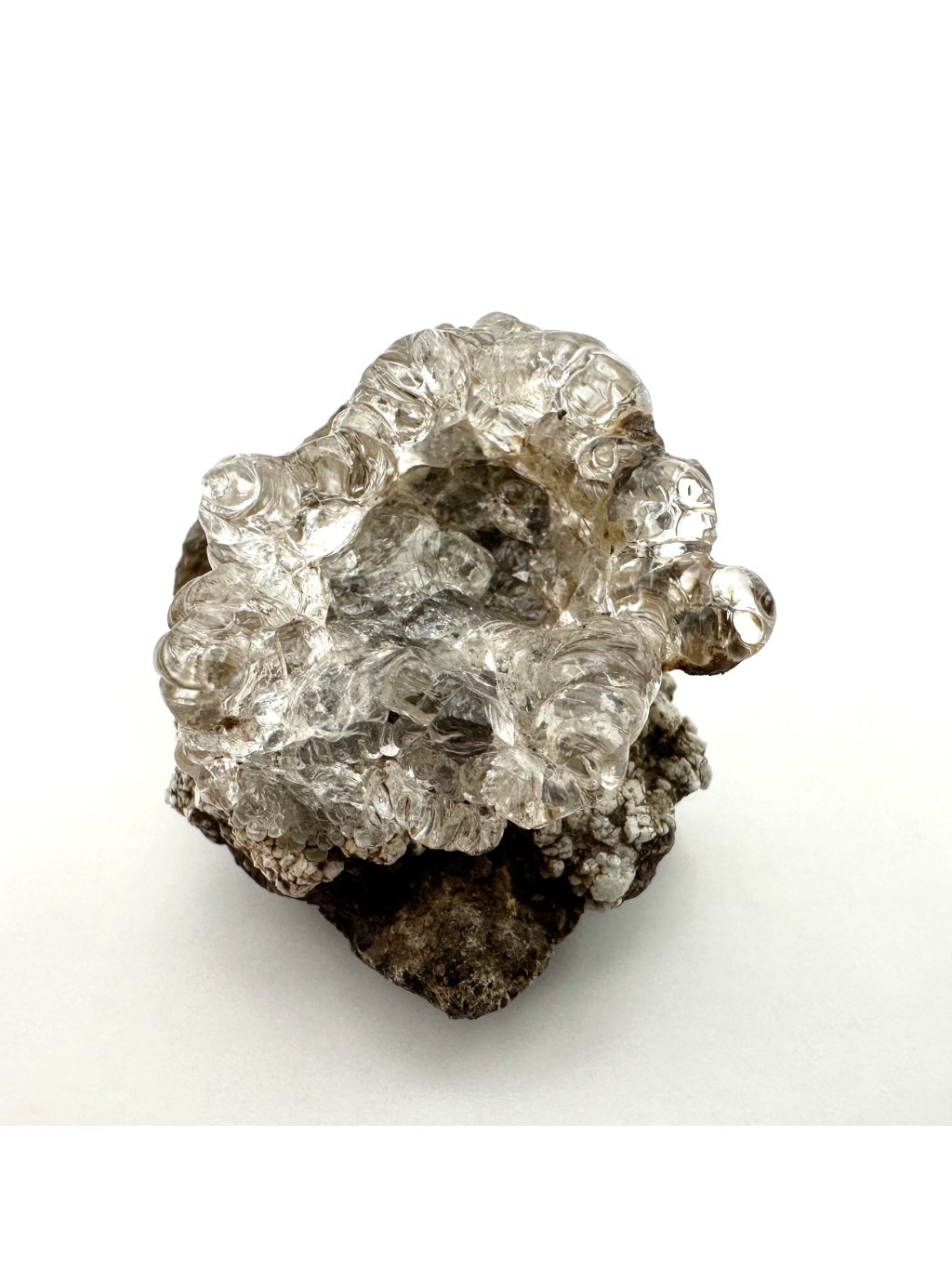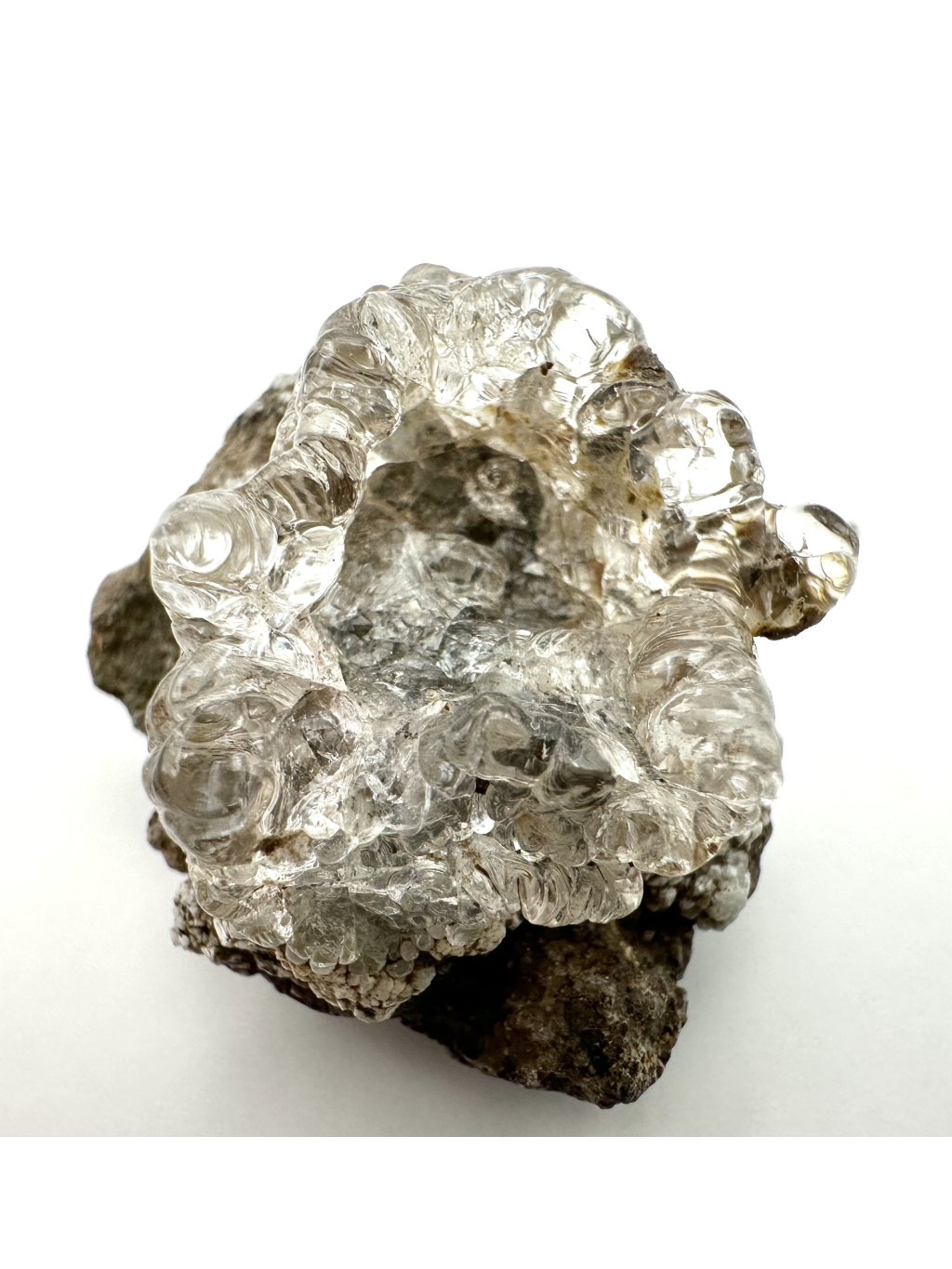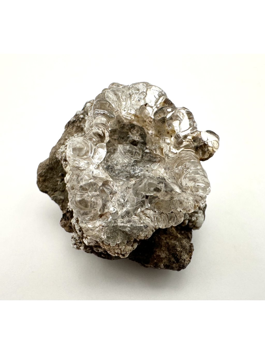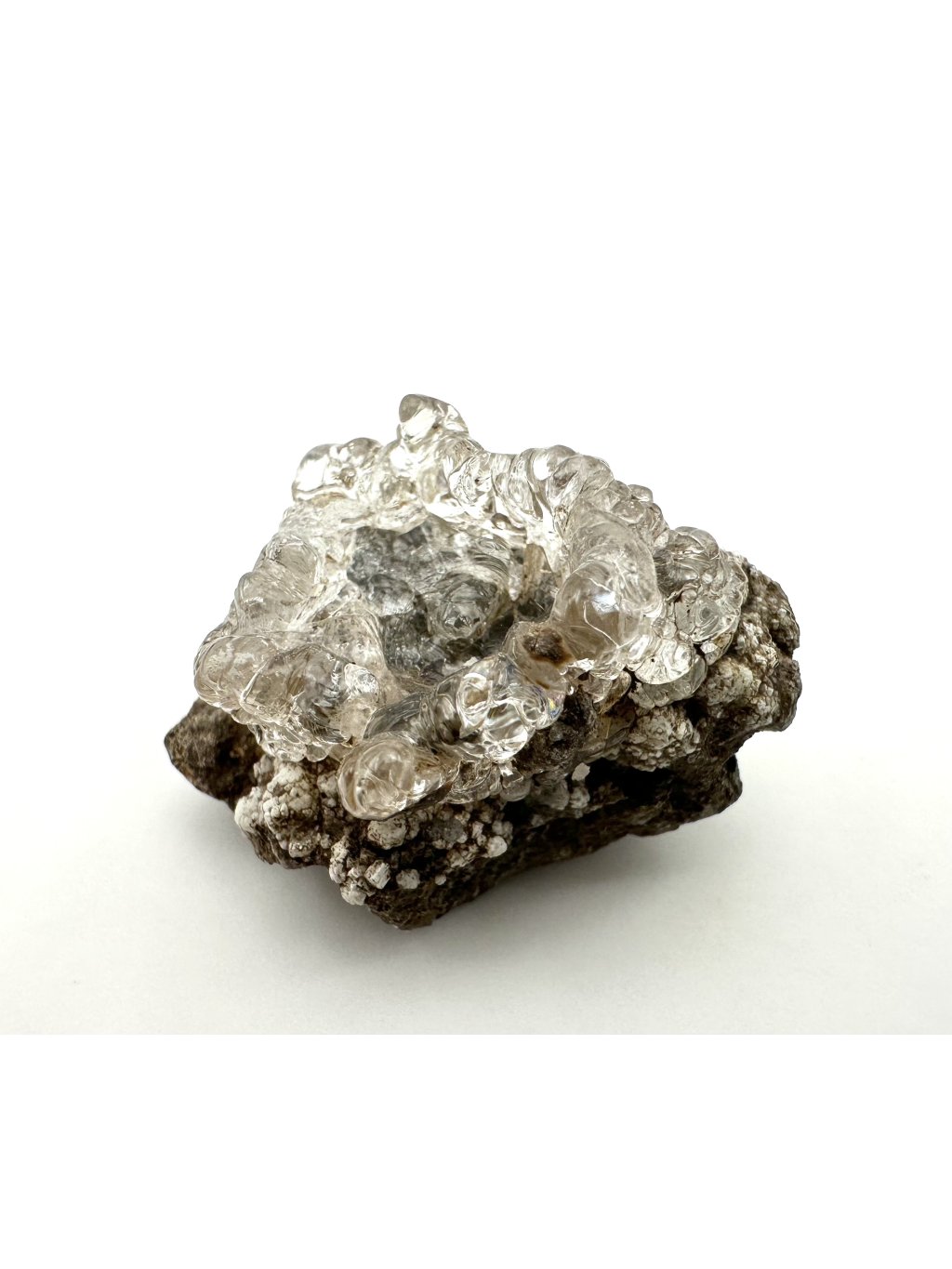 Hyalite, also known as glass opal, is a variety of opal characterized by its clear, colorless to slightly colored texture and characteristic glassy luster. This mineral is composed of silica (SiO₂) and contains water, which gives it its unique properties. Hyalite is formed by hydrothermal processes near the Earth's surface, often in the cavities of igneous rocks such as basalt. In the Czech Republic, there is an important deposit of hyalite in the vicinity of Valec, where it occurs as grape-like or stalactite-like aggregates.