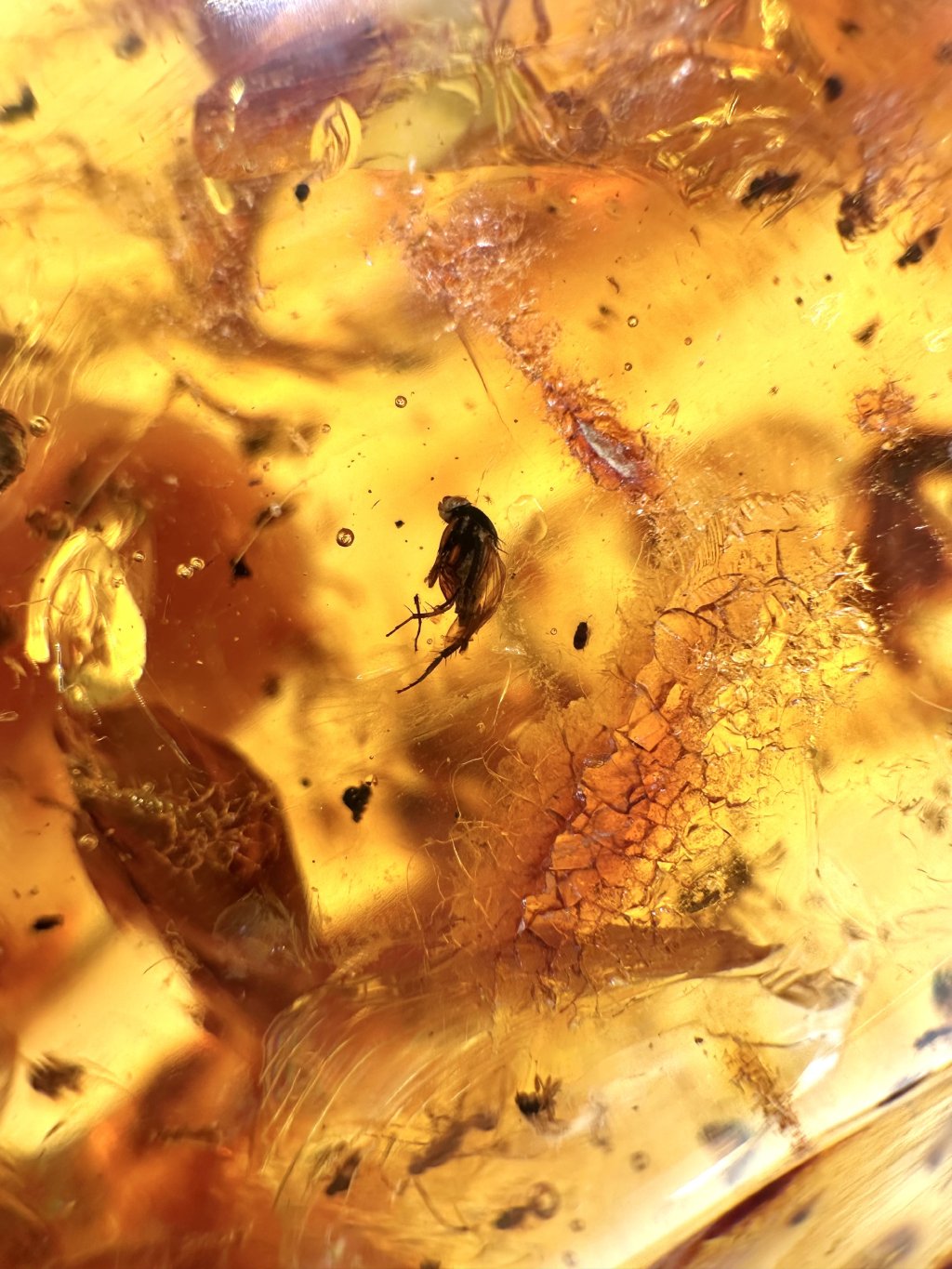 Colombian amber can preserve fossil remains of various prehistoric insects (e.g. ants, termites, mosquitoes, wasps, beetles), arachnids, and plant material such as fibers, leaf fragments, or pollen grains. Rarer inclusions may include tiny pieces of lichens or mosses, providing insight into the rich vegetation and tropical conditions of its time.