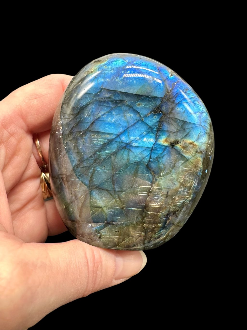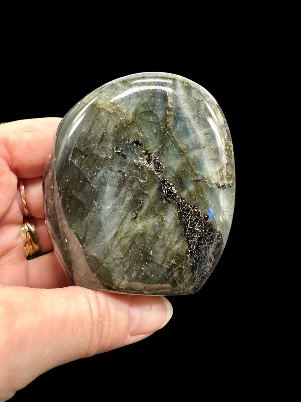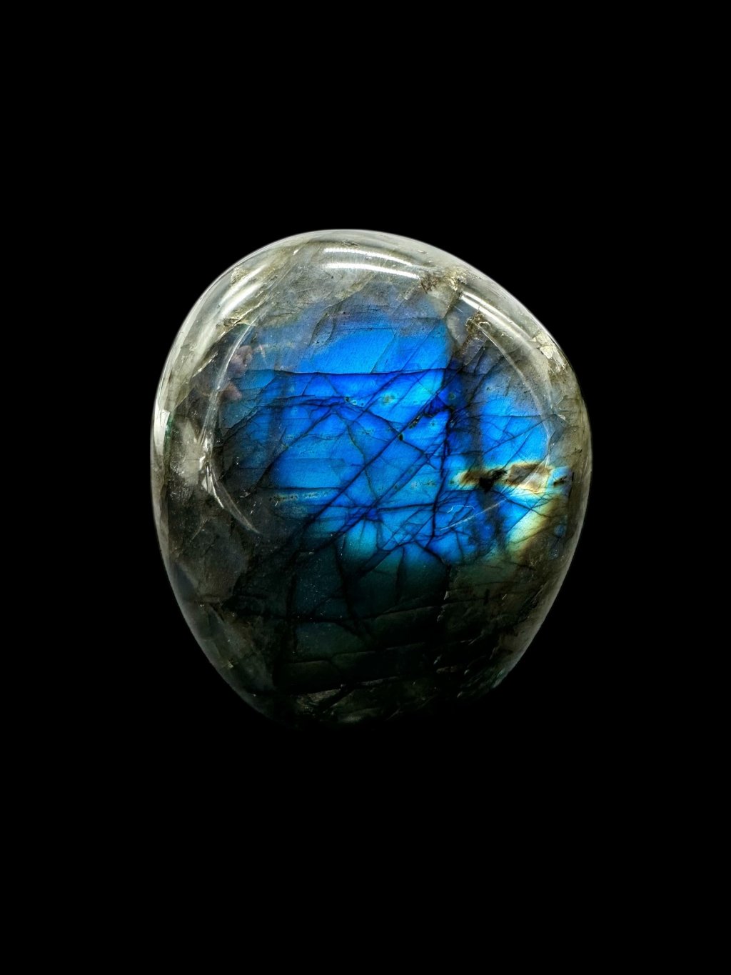Note: The bottom of the labradorite has been modified so that it stands stably on a flat surface and its typical color play stands out as much as possible.