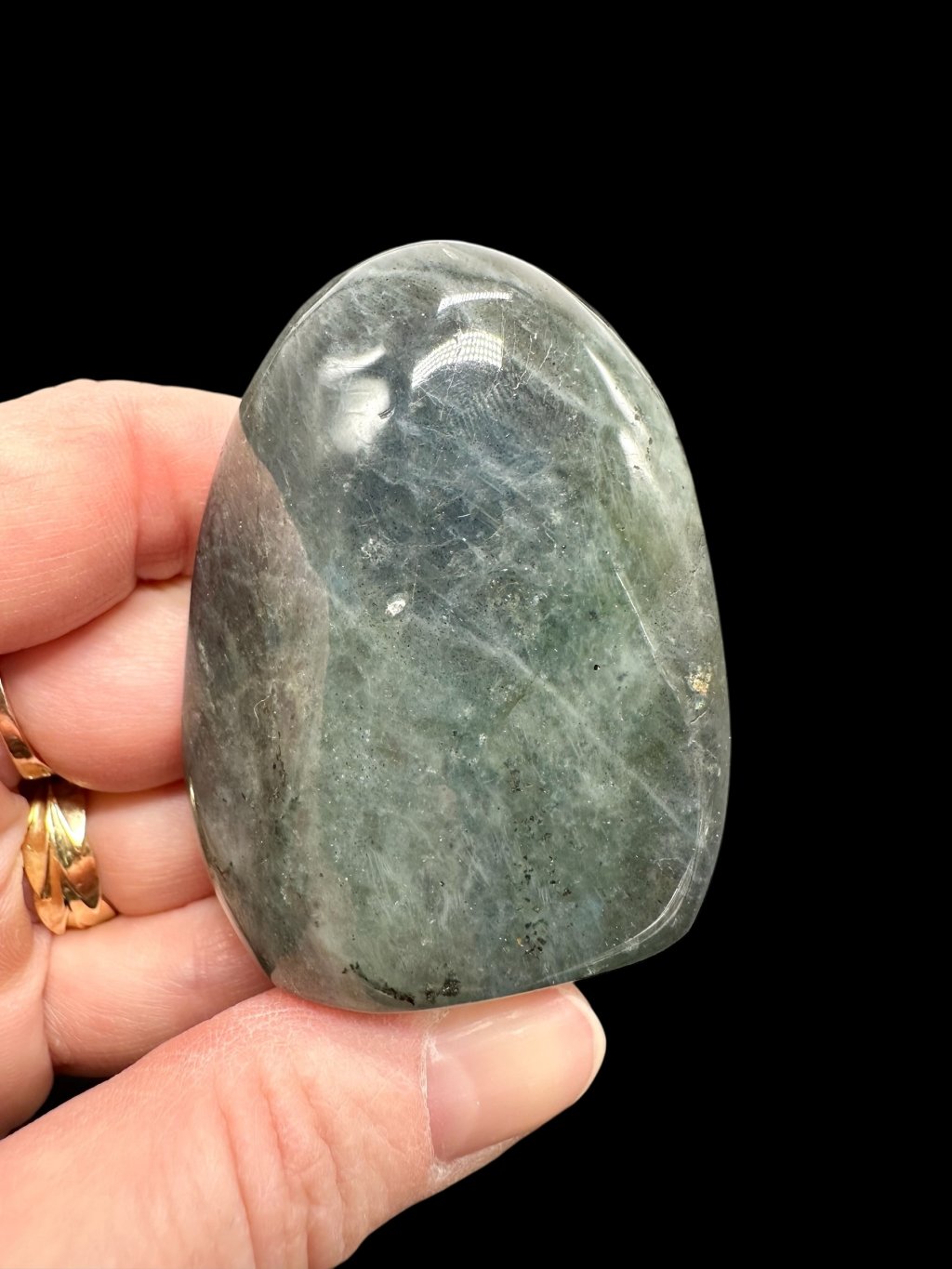 Note: The bottom of the labradorite has been modified so that it stands stably on a flat surface and its typical color play stands out as much as possible.