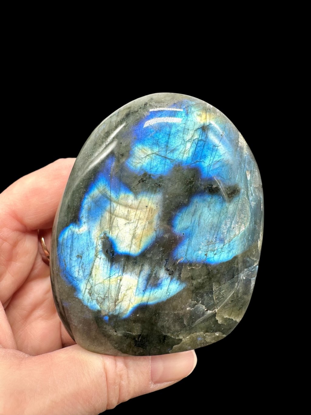 Note: The bottom of the labradorite has been modified so that it stands stably on a flat surface and its typical color play stands out as much as possible.