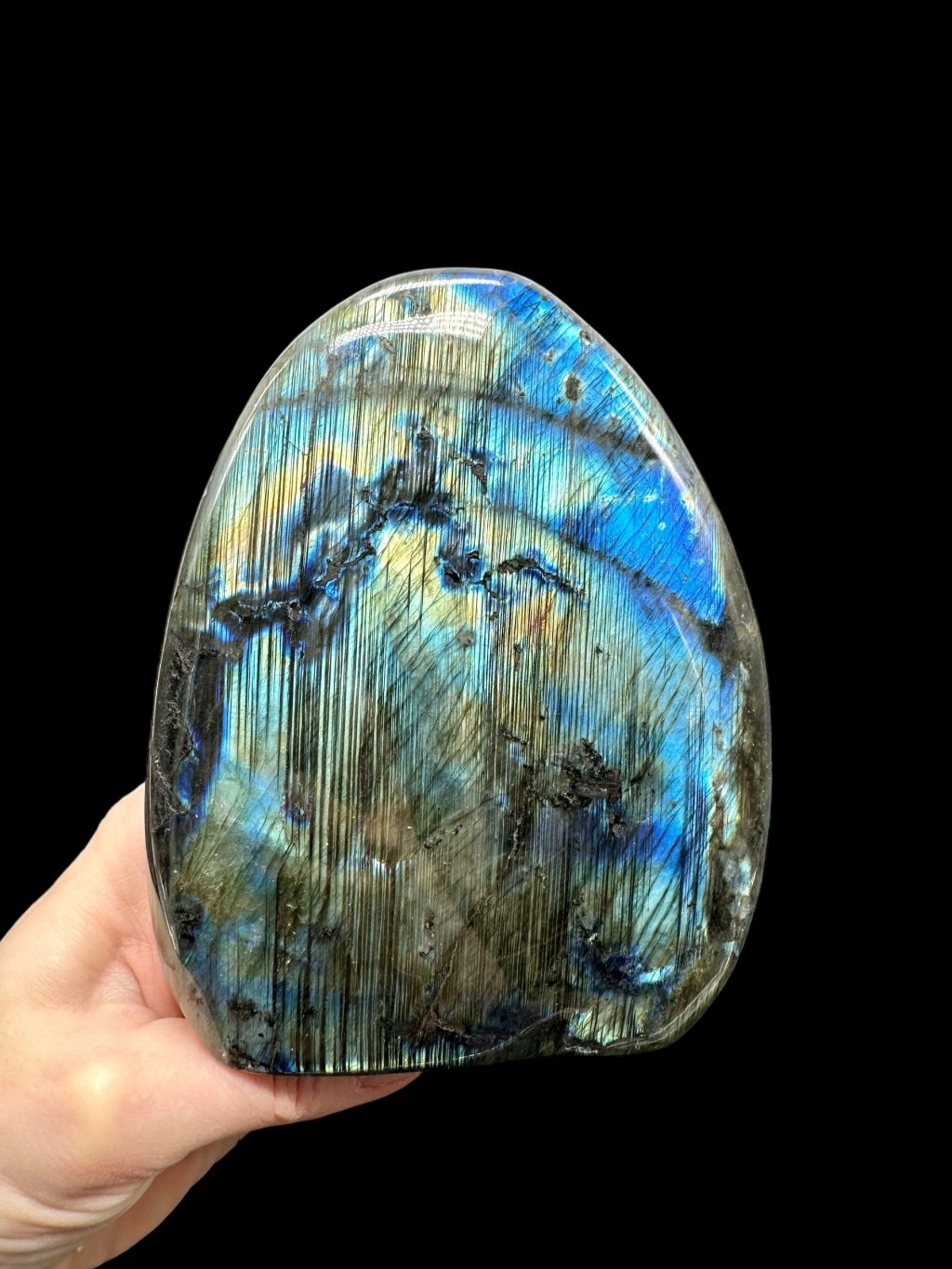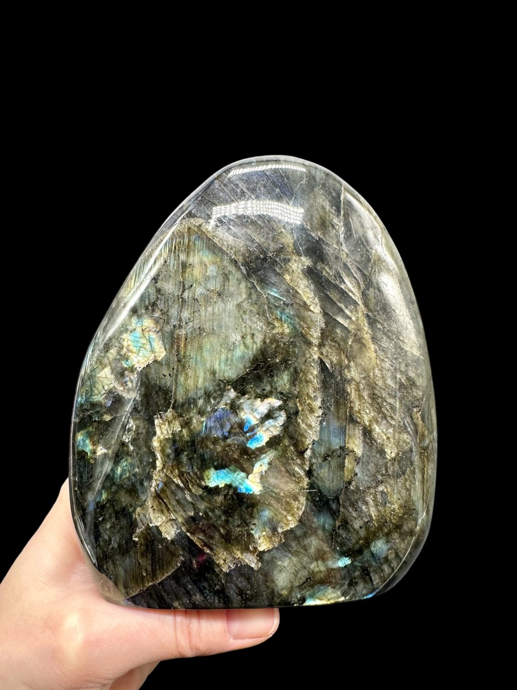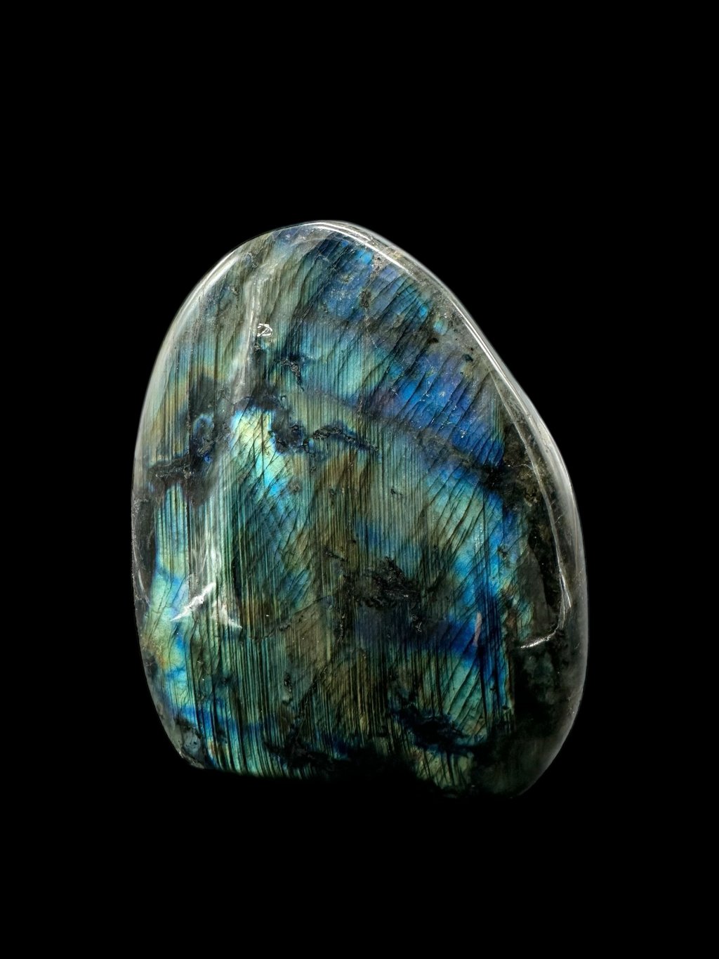 Note: The bottom of the labradorite has been modified so that it stands stably on a flat surface and its typical color play stands out as much as possible.