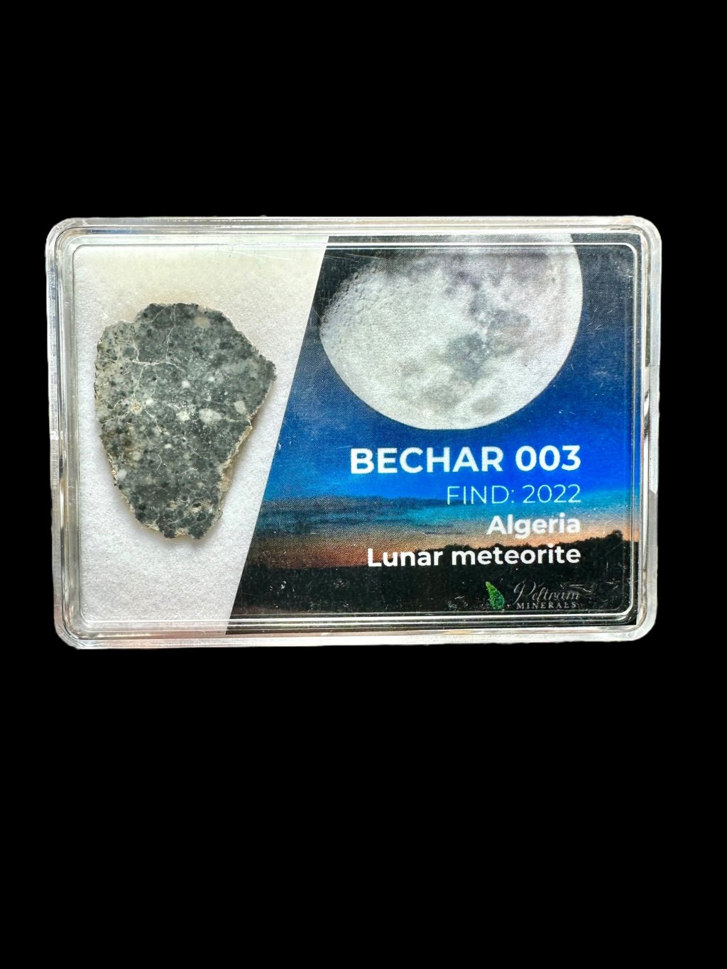 Bechar 003 is a lunar meteorite that originated from an asteroid impact on the lunar surface, which ejected material into space. Some of this material, if fast enough, escapes the Moon’s gravity and heads toward Earth. The journey may take thousands to millions of years before the meteorite finally enters Earth’s atmosphere and lands. The Moon, our closest celestial body, accounts for only 0.08% of all known meteorites, making lunar meteorites extremely rare.