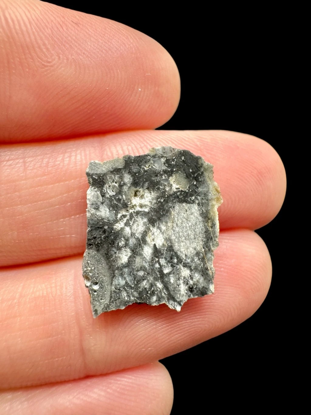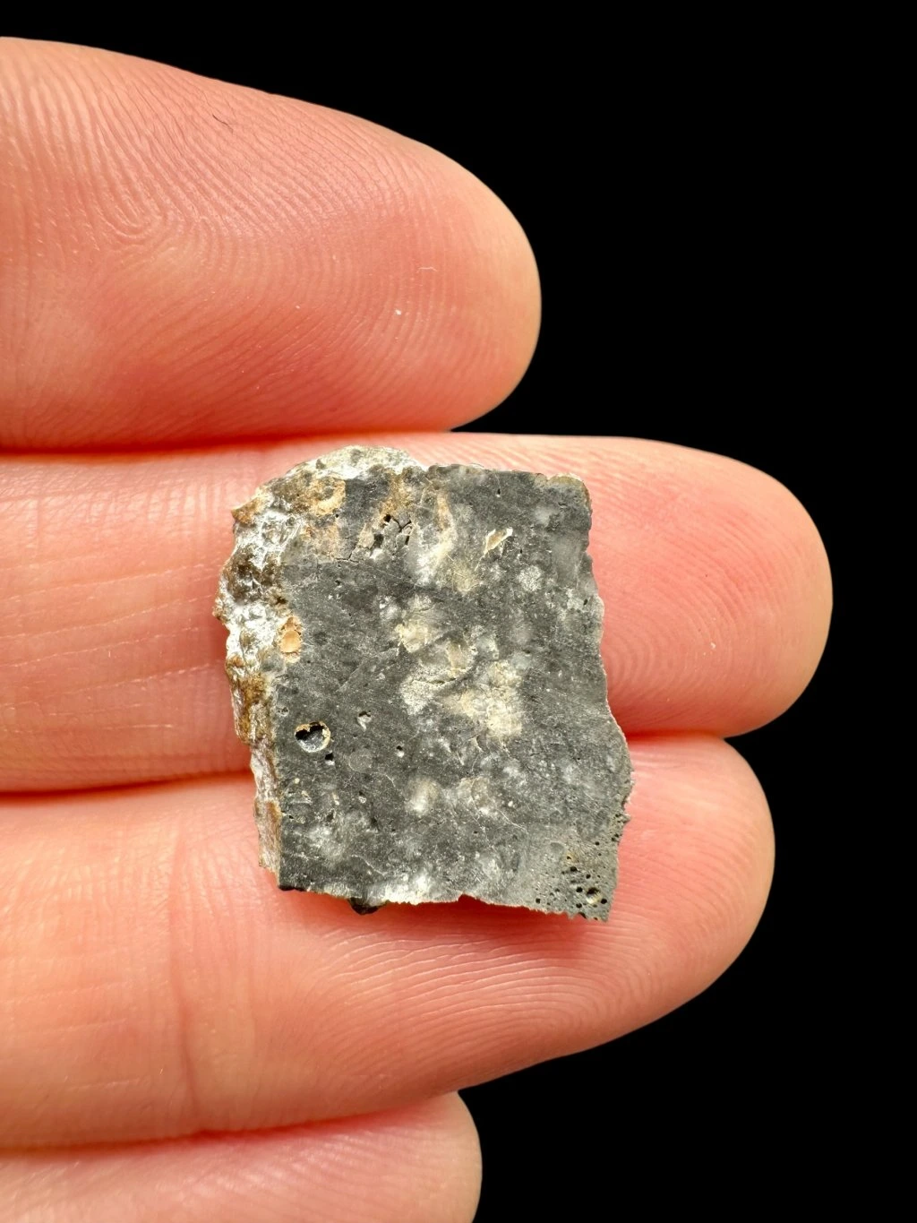 The rock shows clear signs of shock metamorphism, which is typical for meteorites formed during strong impacts. All plagioclase in this specimen has been transformed into maskelynite, indicating exposure to extreme pressures during the impact. The meteorite also contains melt breccia clasts and glassy clasts, which further confirm intense impact processes.
