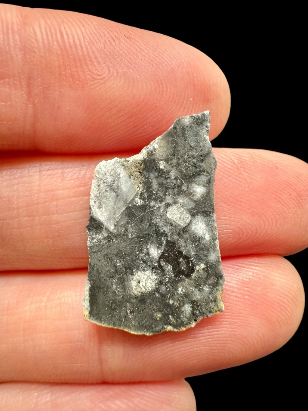 The rock shows clear signs of shock metamorphism, which is typical for meteorites formed during strong impacts. All plagioclase in this specimen has been transformed into maskelynite, indicating exposure to extreme pressures during the impact. The meteorite also contains melt breccia clasts and glassy clasts, which further confirm intense impact processes.