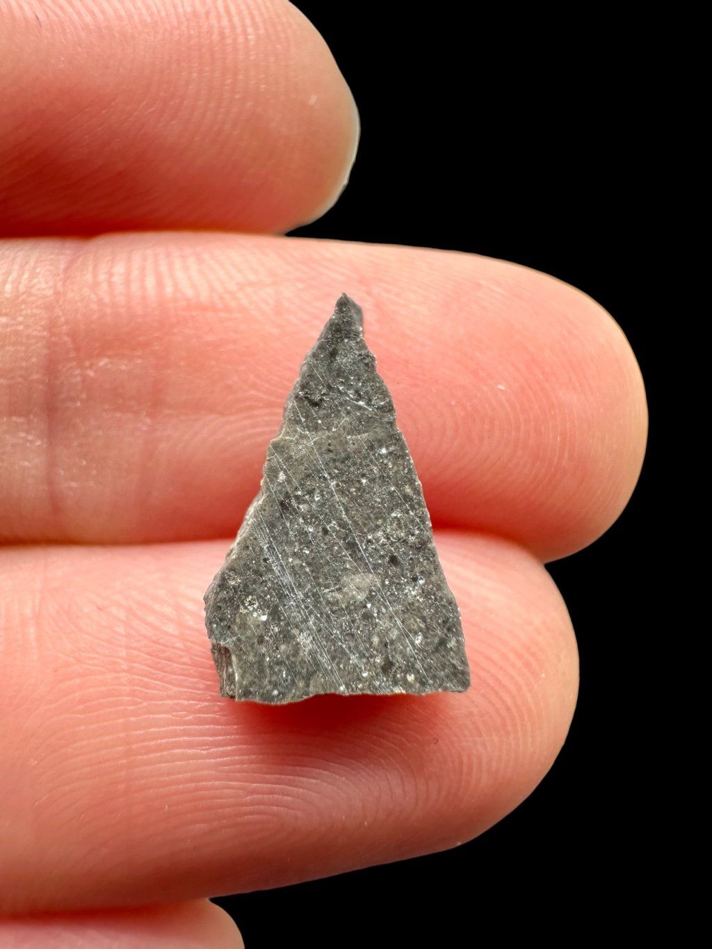The surface of the meteorite is dark gray and partly covered with a light desert crust. Small cavities, known as vesicles, are also present. When cut, however, it reveals a completely different structure – larger rock fragments are bound together by a very fine-grained matrix, forming an interesting natural pattern.