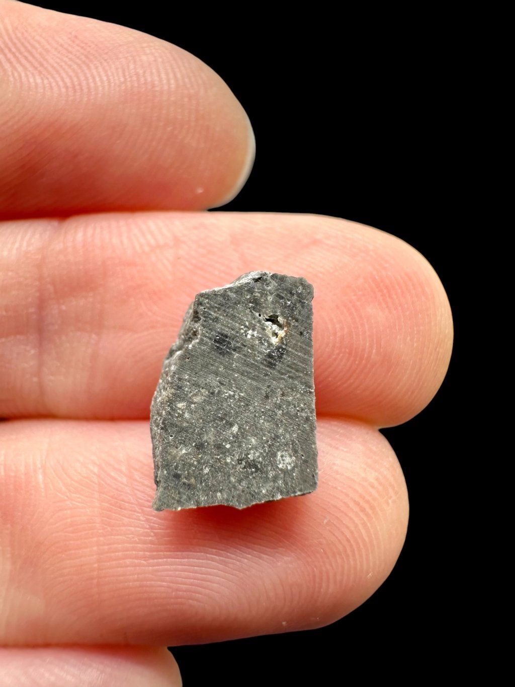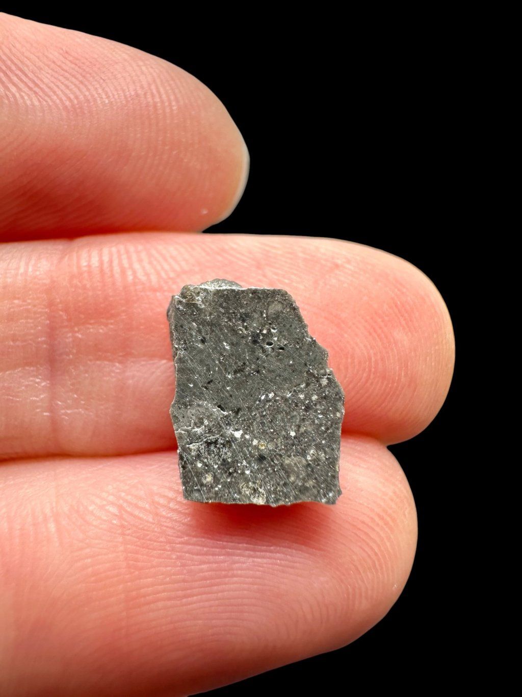 The surface of the meteorite is dark gray and partly covered with a light desert crust. Small cavities, known as vesicles, are also present. When cut, however, it reveals a completely different structure – larger rock fragments are bound together by a very fine-grained matrix, forming an interesting natural pattern.
