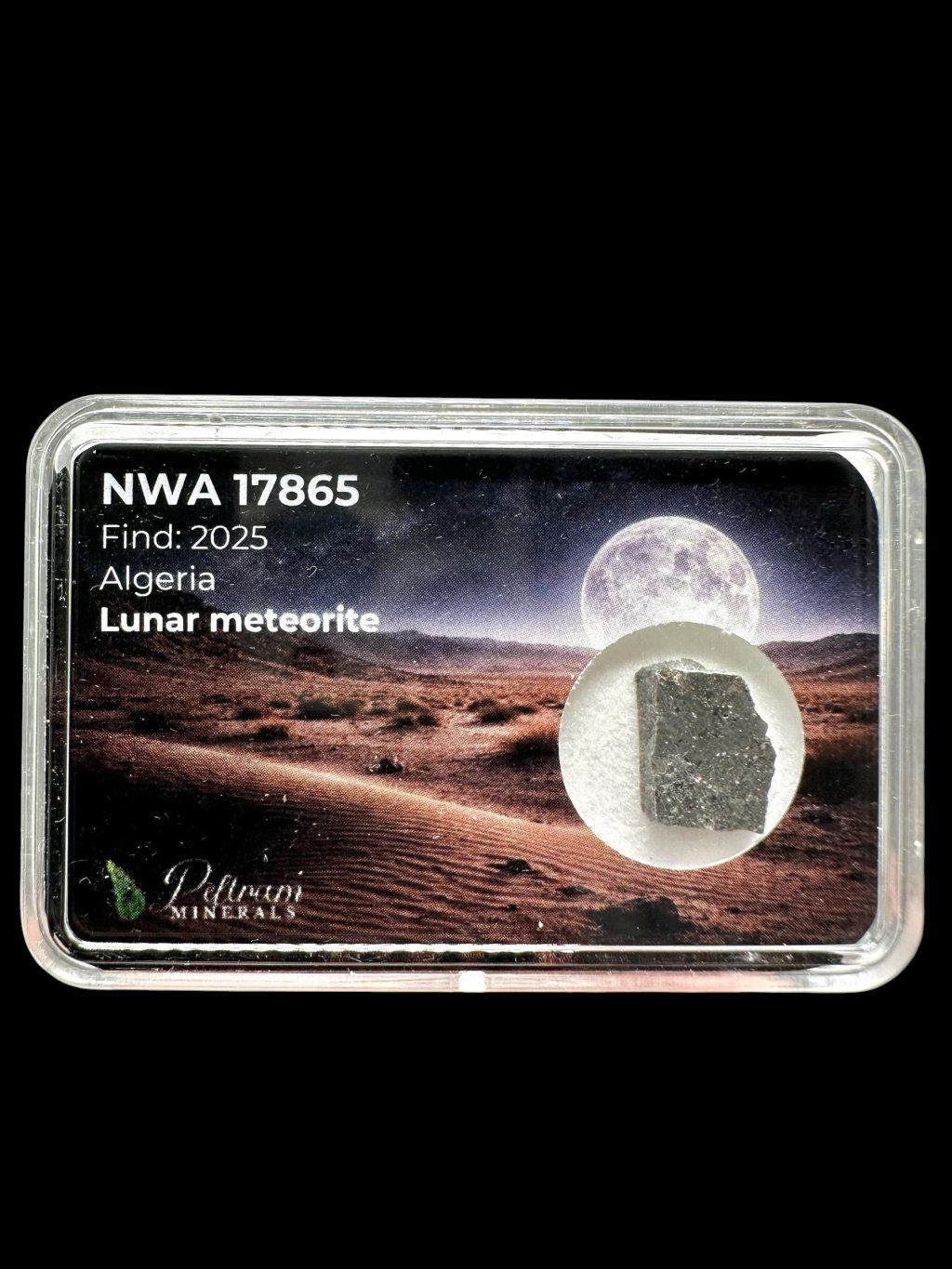 NWA 17865 is an exceptional lunar meteorite originating from the Algerian Sahara, discovered in 2025. In fact, it consists of two nearly identical stones weighing 5951 g and 4249 g, making it a remarkable find among lunar meteorites. This material represents a true fragment of the lunar crust, ejected from the surface of the Moon during an ancient impact event.