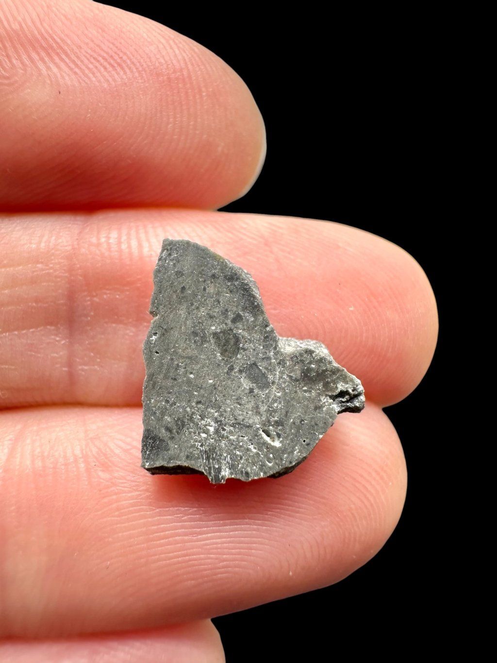 The surface of the meteorite is dark gray and partly covered with a light desert crust. Small cavities, known as vesicles, are also present. When cut, however, it reveals a completely different structure – larger rock fragments are bound together by a very fine-grained matrix, forming an interesting natural pattern.