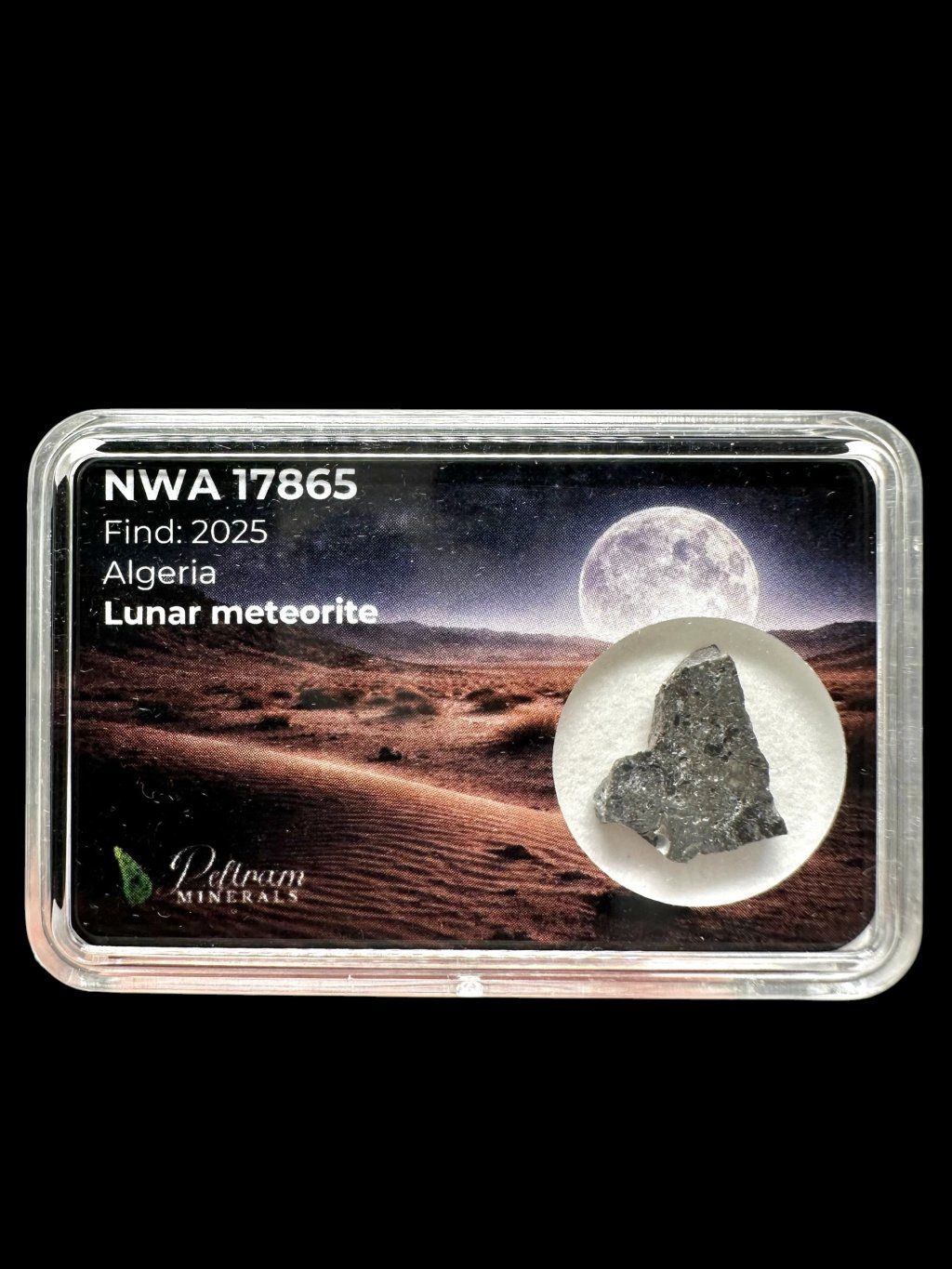 NWA 17865 is an exceptional lunar meteorite originating from the Algerian Sahara, discovered in 2025. In fact, it consists of two nearly identical stones weighing 5951 g and 4249 g, making it a remarkable find among lunar meteorites. This material represents a true fragment of the lunar crust, ejected from the surface of the Moon during an ancient impact event.