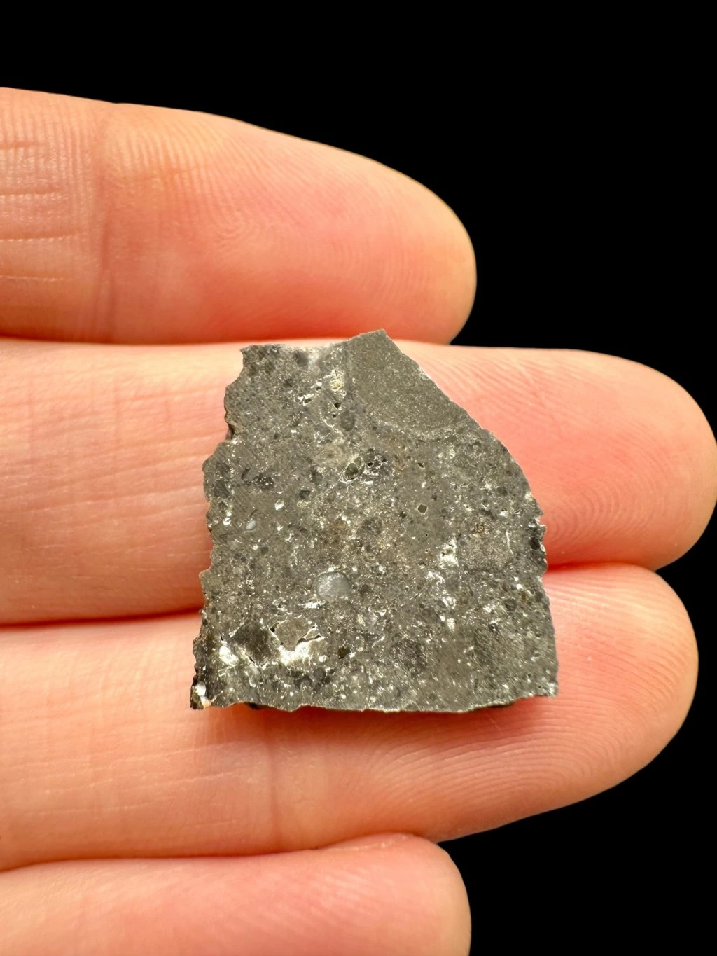 The surface of the meteorite is dark gray and partly covered with a light desert crust. Small cavities, known as vesicles, are also present. When cut, however, it reveals a completely different structure – larger rock fragments are bound together by a very fine-grained matrix, forming an interesting natural pattern.