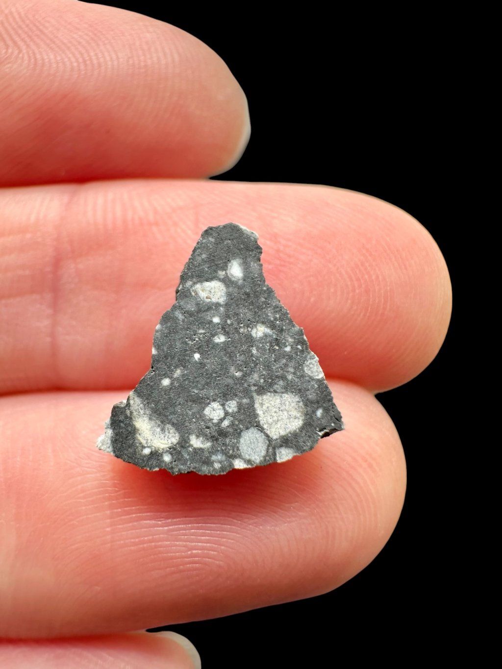 Ouargla 008 belongs to so-called brecciated meteorites, meaning it is composed of various rock fragments bound together into a single compact mass. It mainly contains anorthositic components, typical for the lunar crust, as well as darker mafic rocks such as gabbro. This combination makes the meteorite a valuable source of information about various geological processes occurring on the Moon.