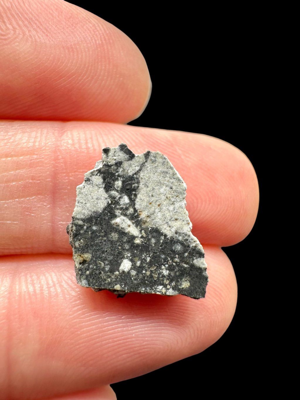 Ouargla 008 belongs to so-called brecciated meteorites, meaning it is composed of various rock fragments bound together into a single compact mass. It mainly contains anorthositic components, typical for the lunar crust, as well as darker mafic rocks such as gabbro. This combination makes the meteorite a valuable source of information about various geological processes occurring on the Moon.