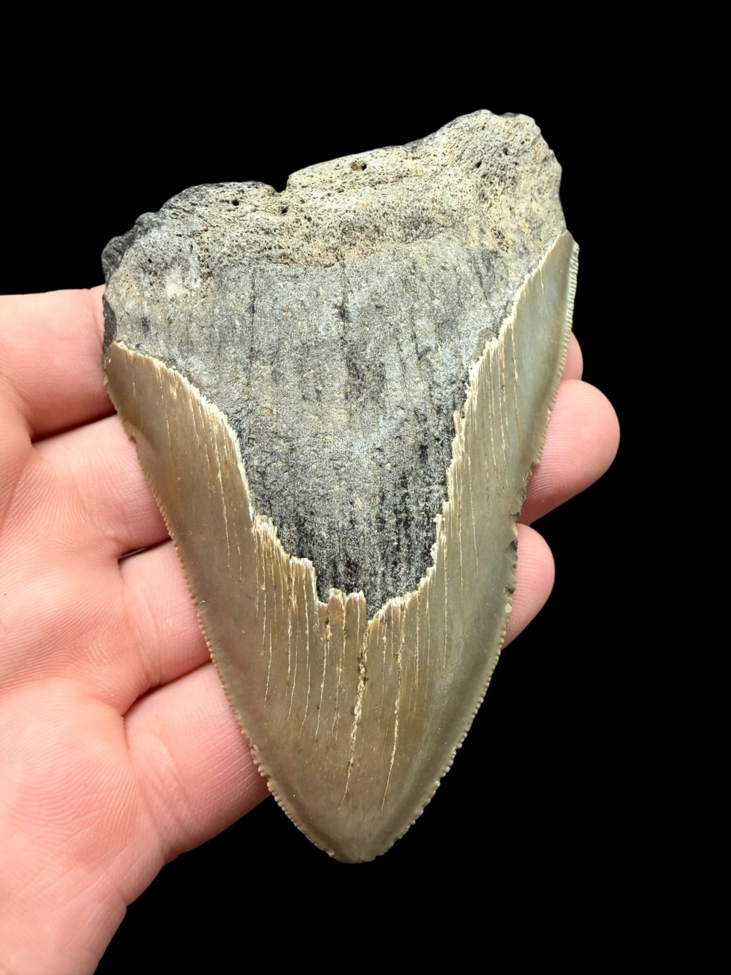 Megalodon teeth are typically assessed according to two main measurements: maximum length (from the tip to the end of the root section) and width. These parameters help not only with comparing specimens but also with estimating the size of the shark itself.