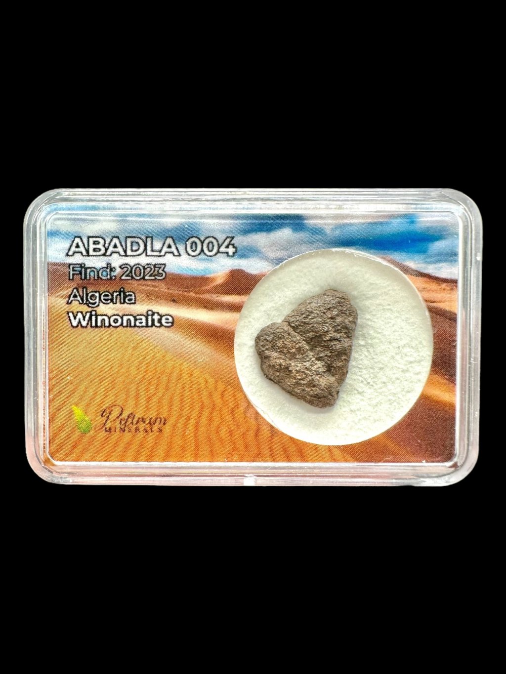 Abadla 004, discovered in 2023 near the city of Bechar, Algeria, belongs to the rare category of primitive achondrites, specifically the winonaite group. Its composition is similar to chondrites, particularly H and E types. These meteorites show signs of metamorphism, partial melting, brecciation, and often contain relict chondrules, characteristic of their chemical and mineralogical composition lying between H and E chondrites.