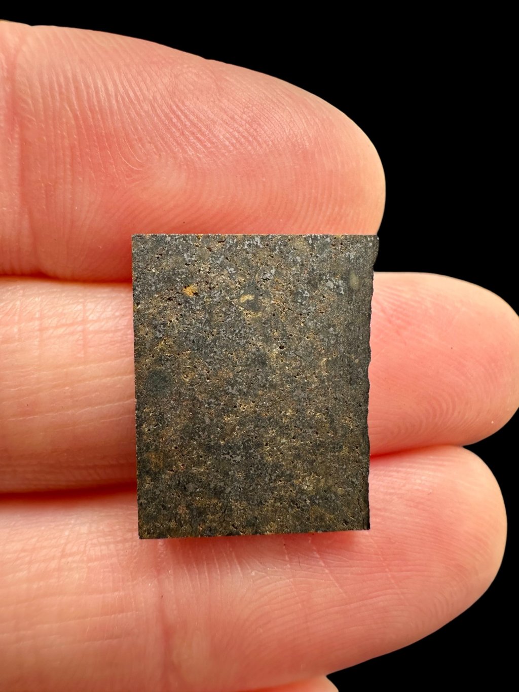 Overall, the meteorite has a finely brecciated structure – slightly fractured and re-cemented – which is the result of previous collisional events in space. This texture, along with the low metal content and visible metamorphic features, corresponds to the LL6 classification.