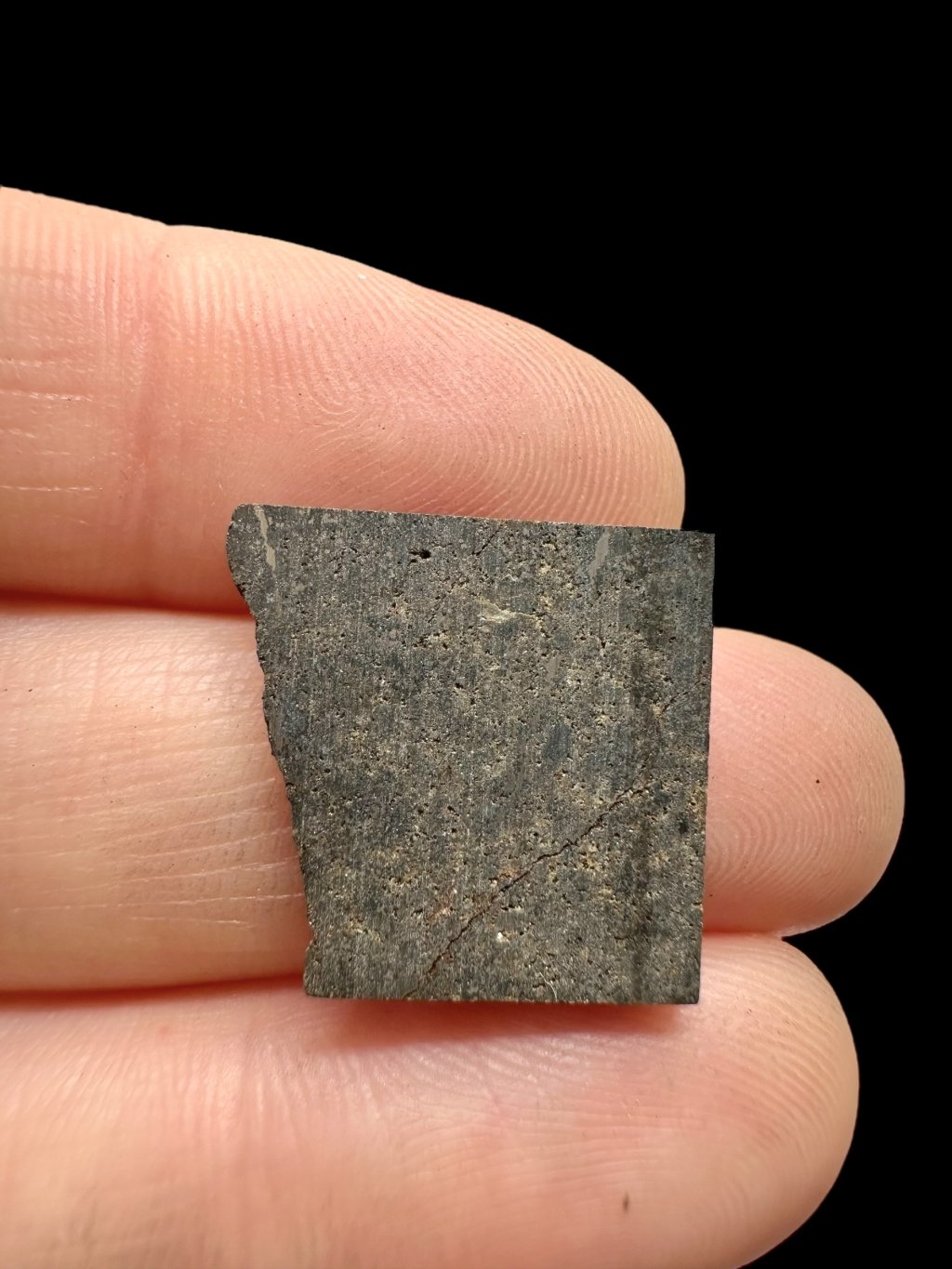 The internal structure shows signs of thermal metamorphism – the rock was transformed by high temperatures, which is typical for LL6 chondrites. This means the original spherical chondrules are partially or completely blurred and have merged with the surrounding matrix.
