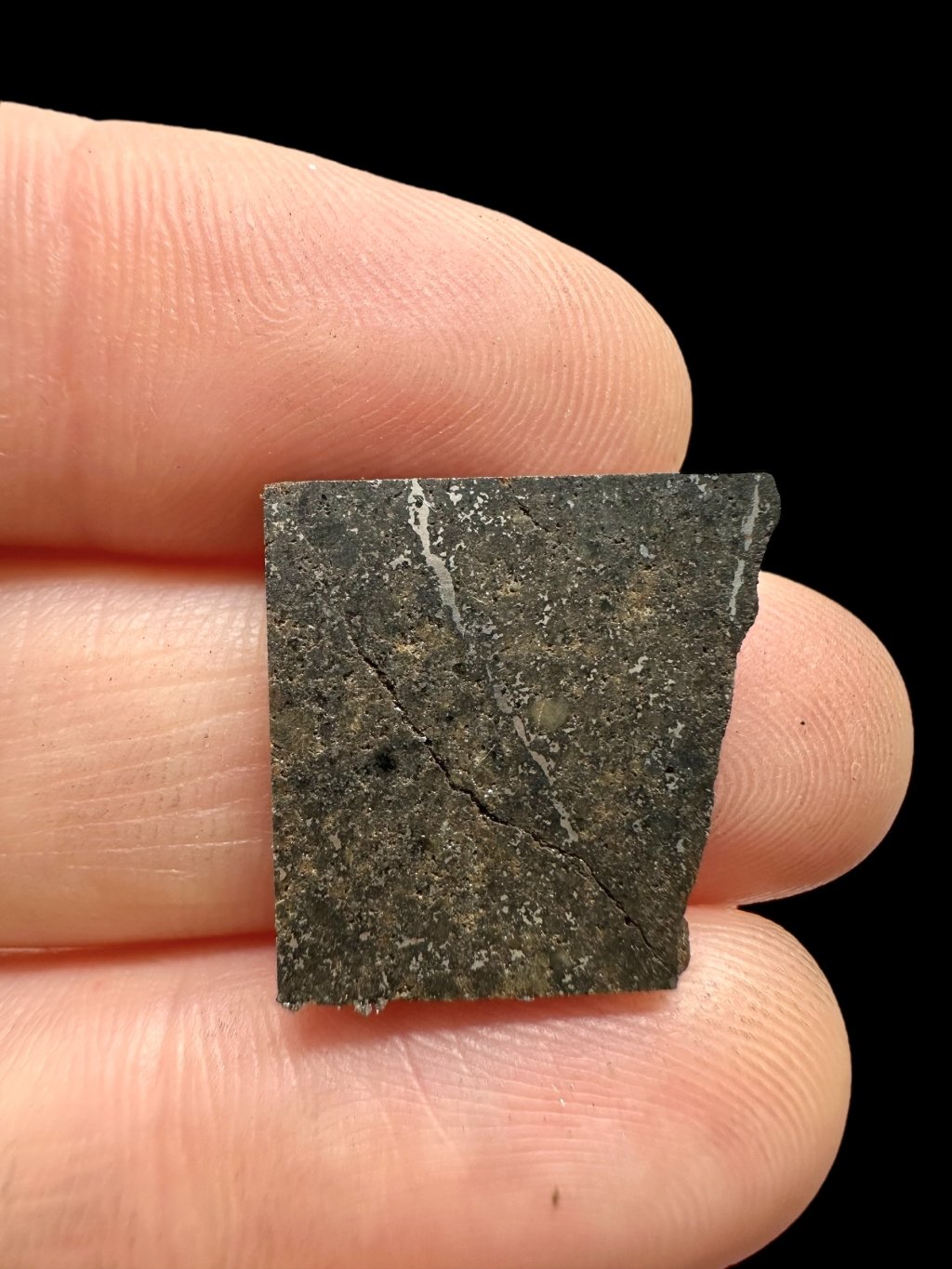 Some specimens also show small cracks partially filled with a whitish deposit known as caliche – a carbonate material that forms in arid (dry) environments where the meteorite remained for a long time after its fall.