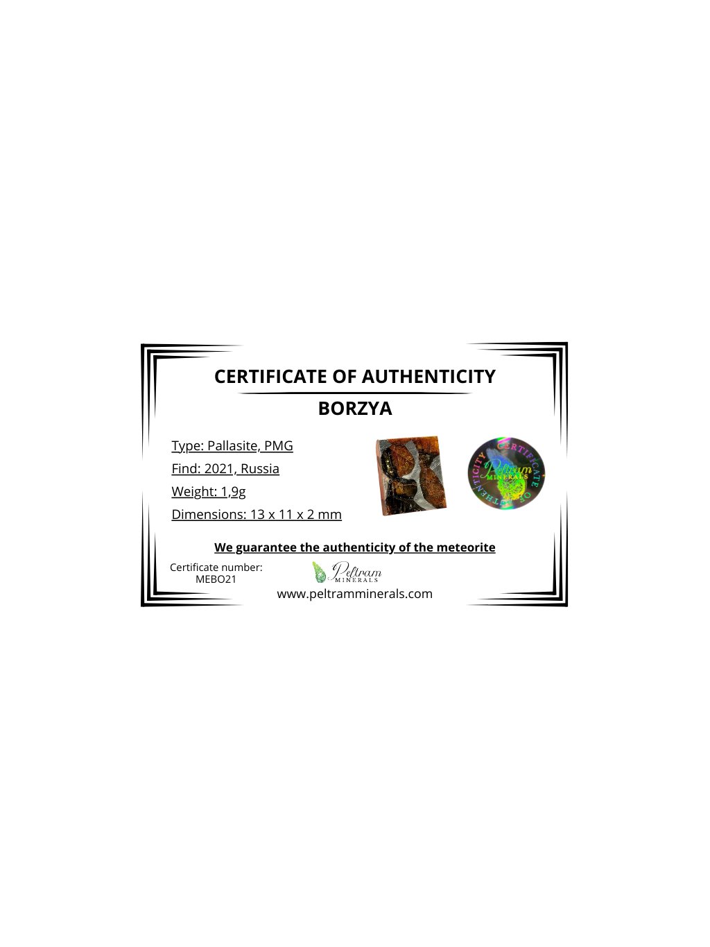 The Borzya meteorite was discovered in May 2021 in Zabaykalsky Krai in Russia (near the town of Borzya). This meteorite is classified among main group pallasites. It consists of rounded olivine crystals, which are surrounded by iron and nickel alloys. The olivine crystals are mostly inclusion-free, but some contain finely connected chromite needles and calcium pyroxene.